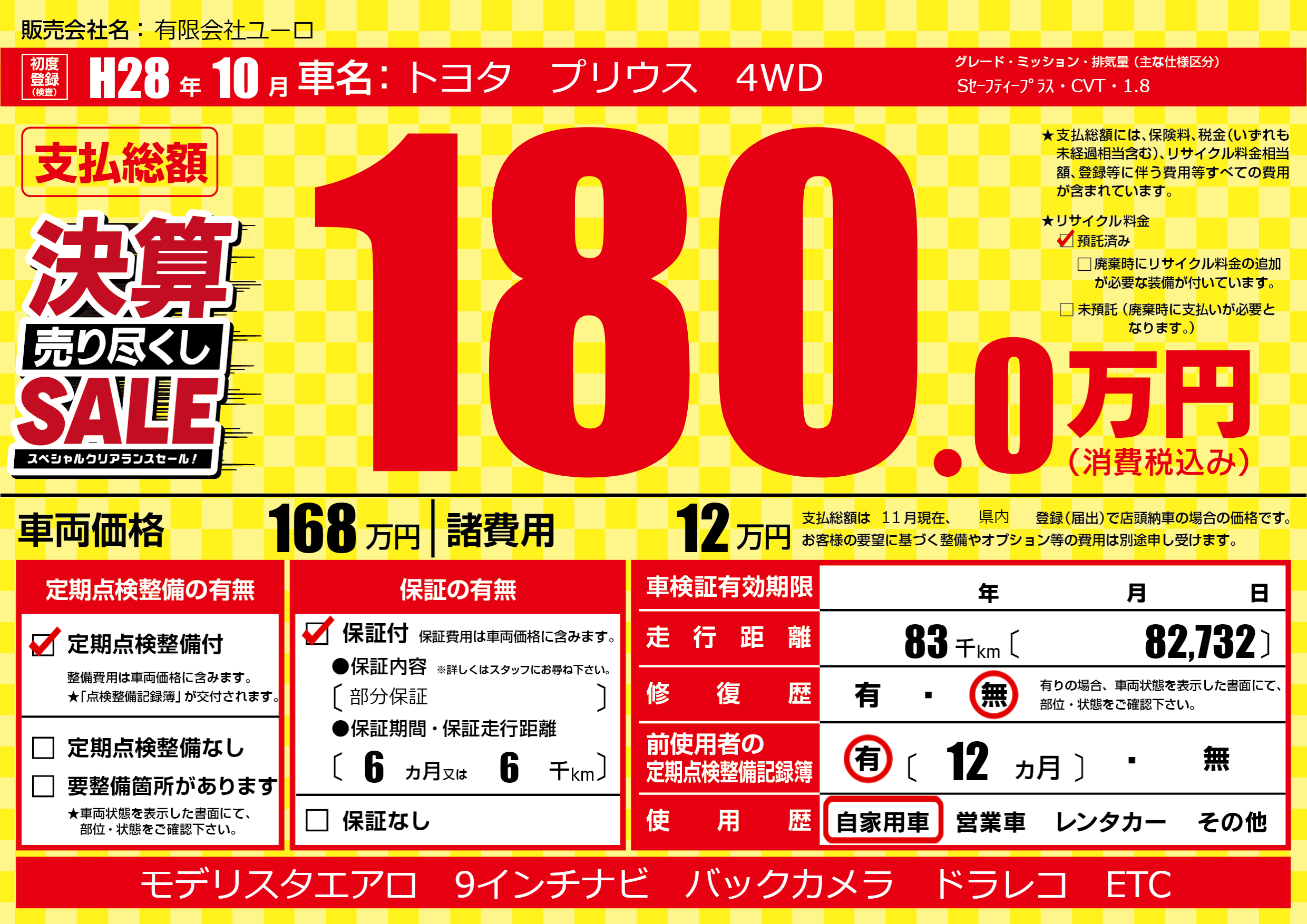 | 車名 | トヨタ プリウス 4WD | グレード ミッション 排気量 |