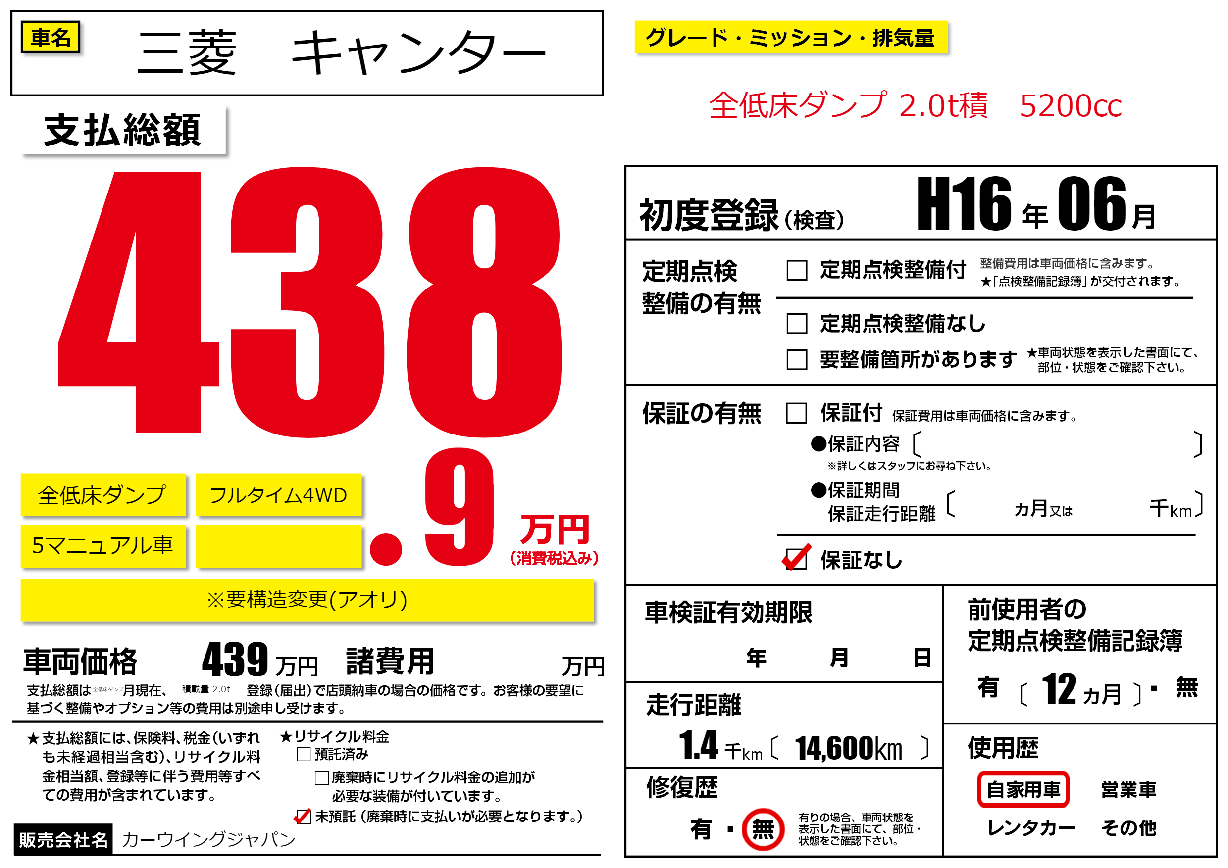| 車名 | 三菱 キャンター | グレード ミッション 排気量 |