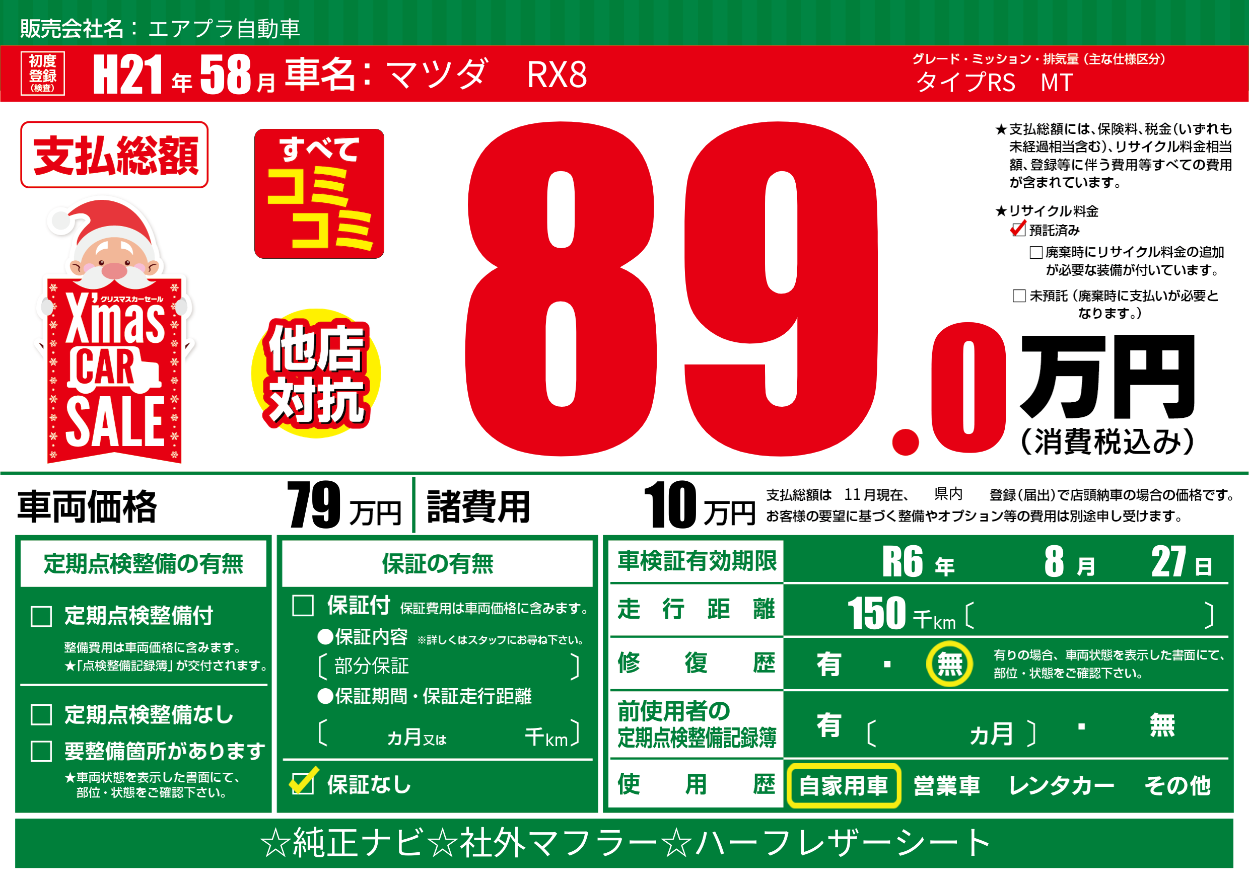 | 車名 | マツダ RX8 | グレード ミッション 排気量 |