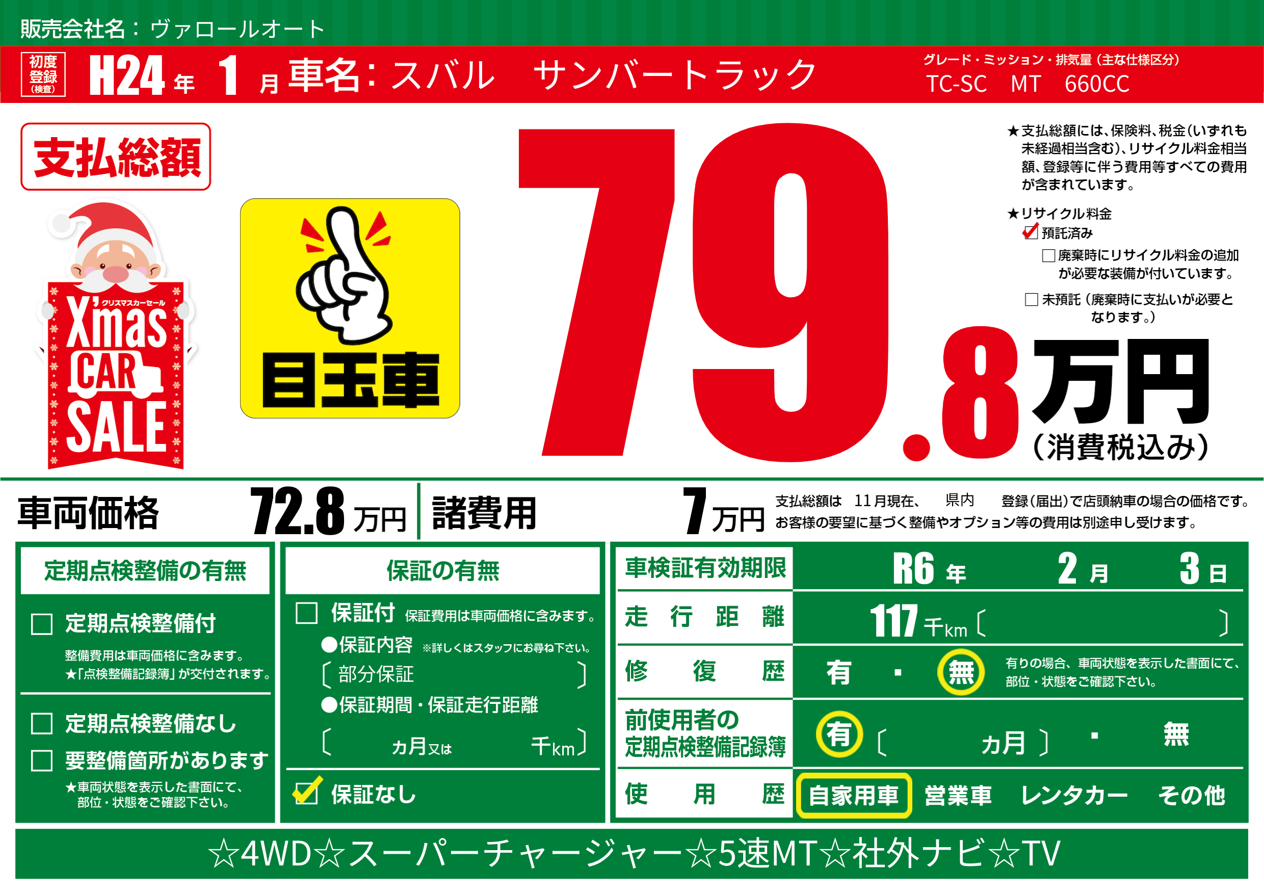 | 車名 | スバル サンバートラック | グレード ミッション 排気量 |