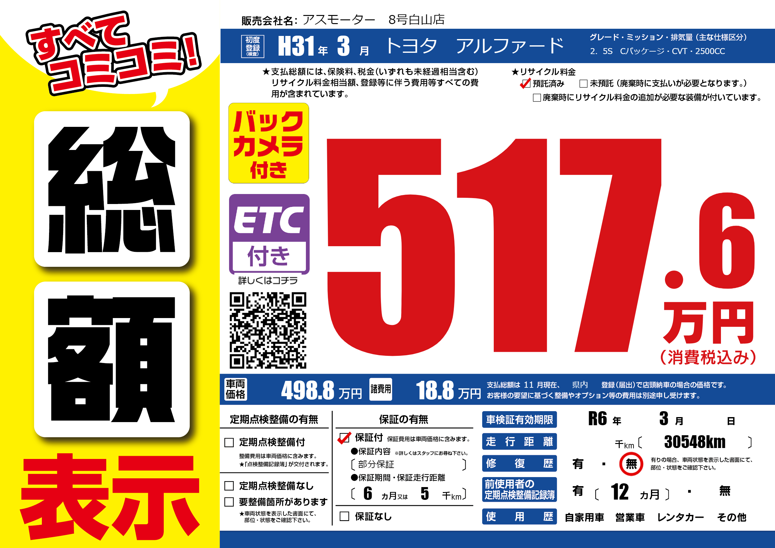 | 走行キロ | - | 初年度登録 | H31年3月 |