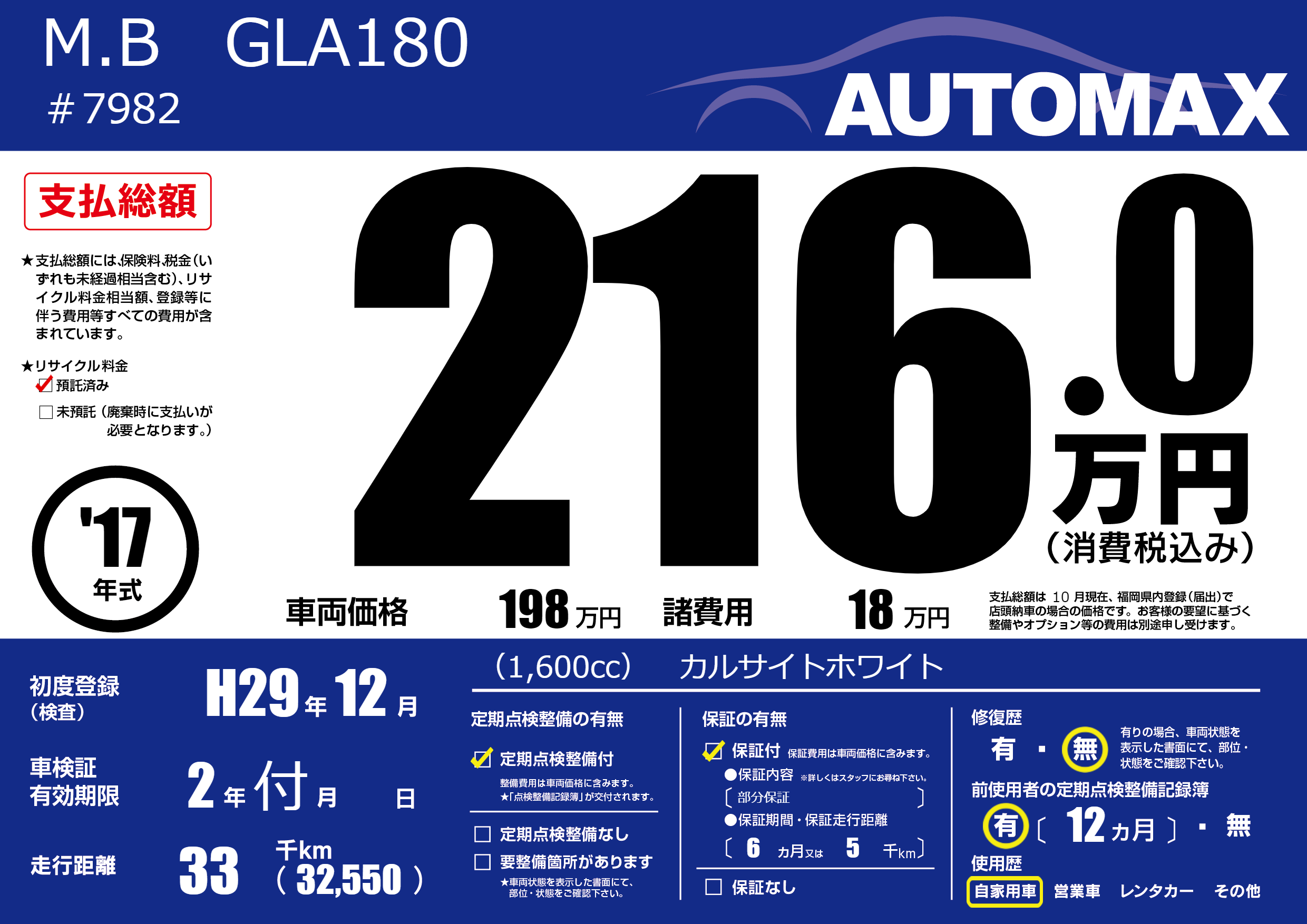 | 車名 | M.B GLA180 | グレード ミッション 排気量 |