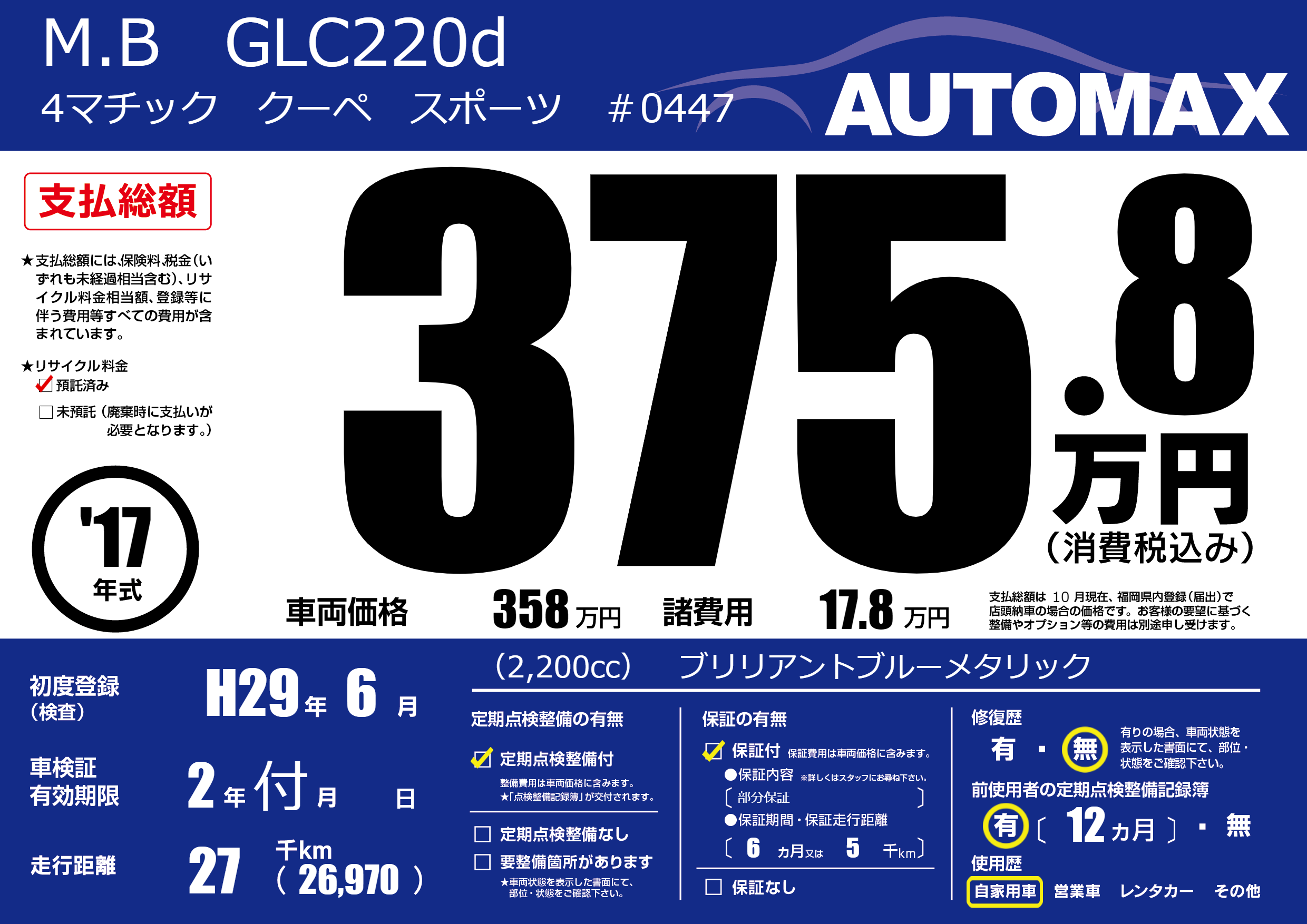 | 車名 | M.B GLC220d | グレード ミッション 排気量 |