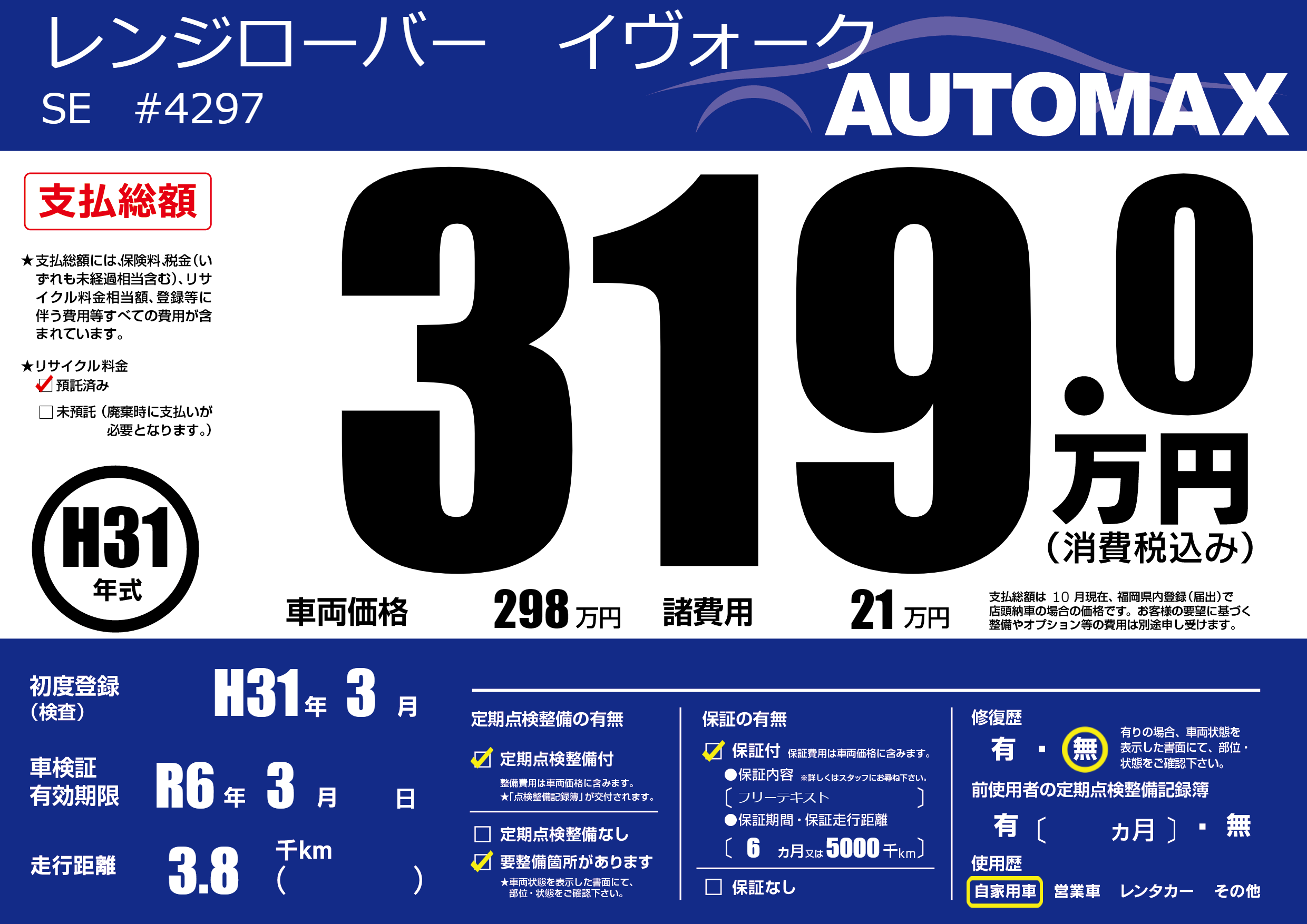 | 車検制限 | R6年 3月 - 日 | ||