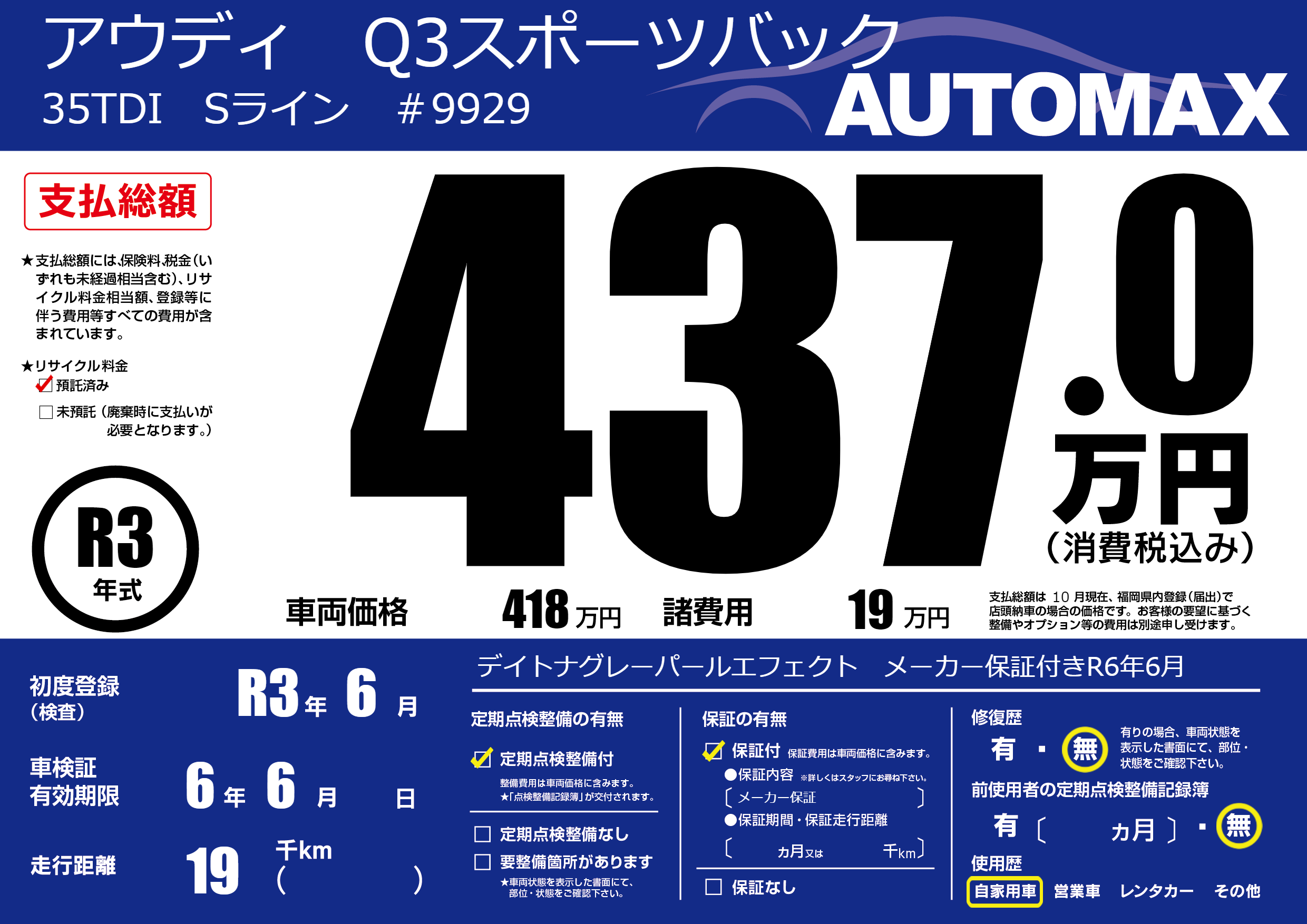 | 車名 | アウディ Q3スポーツバック | グレード ミッション 排気量 |