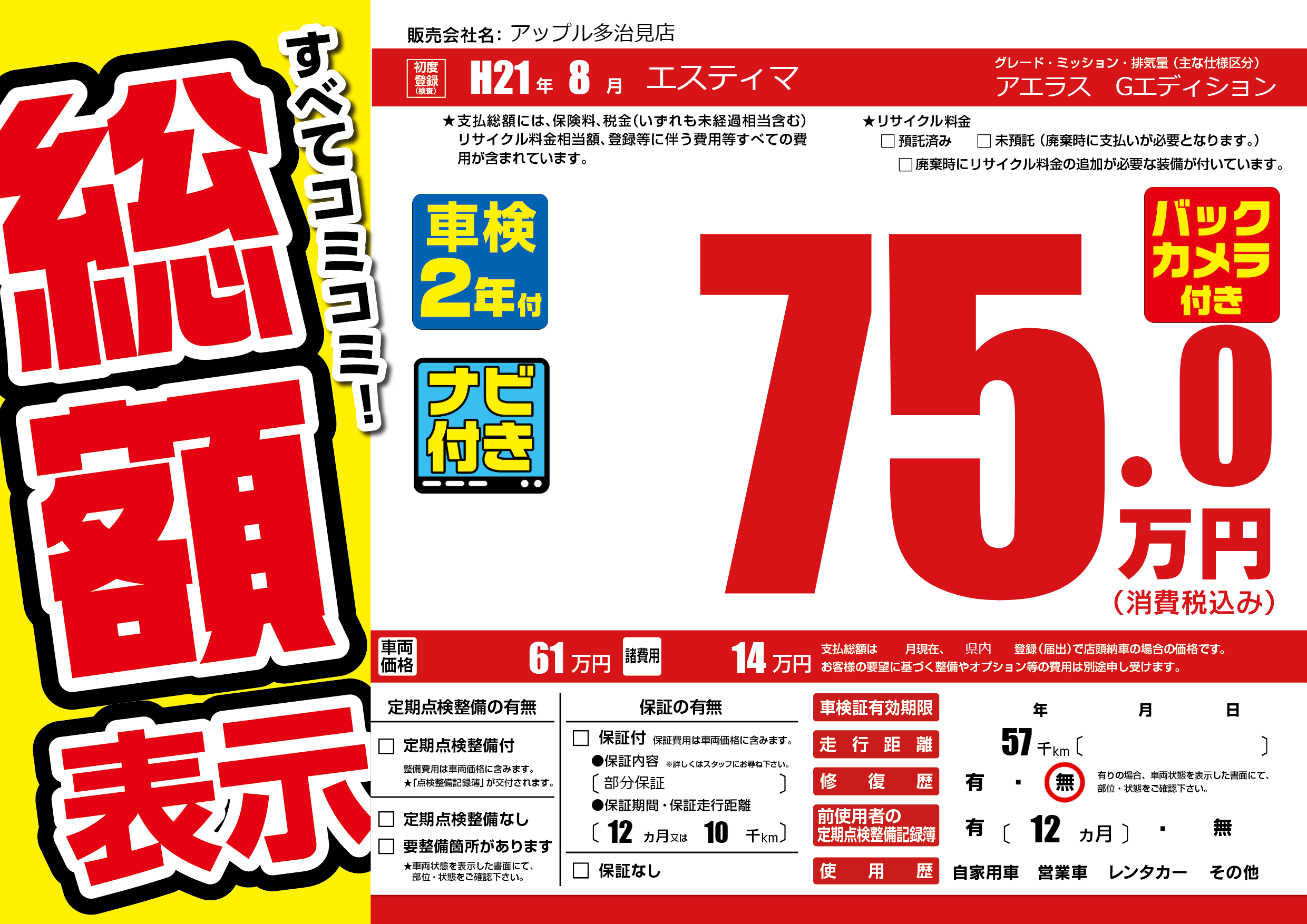 | 車名 | エスティマ | グレード ミッション 排気量 |
