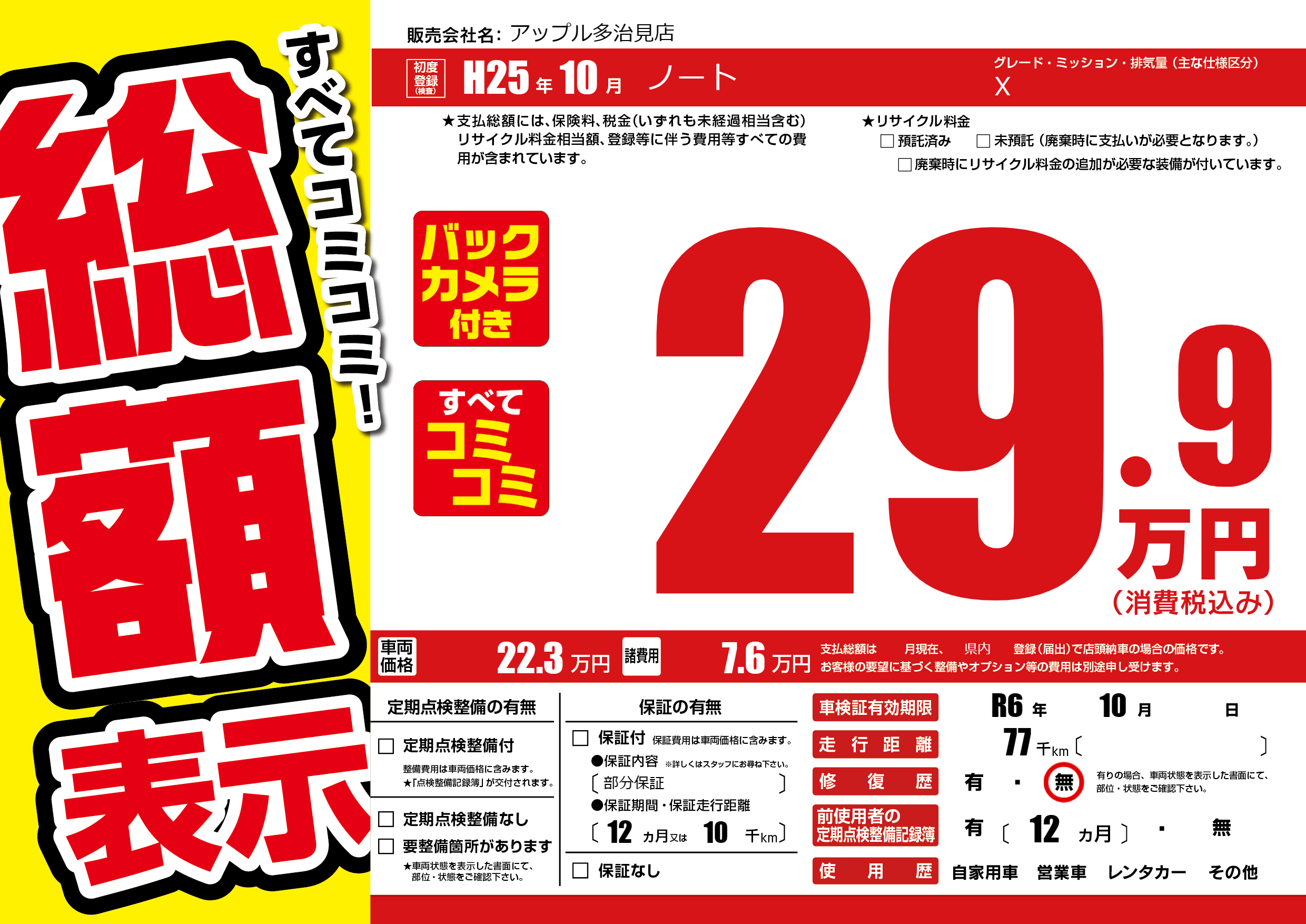 | 走行キロ | 7.7万km | 初年度登録 | H25年10月 |