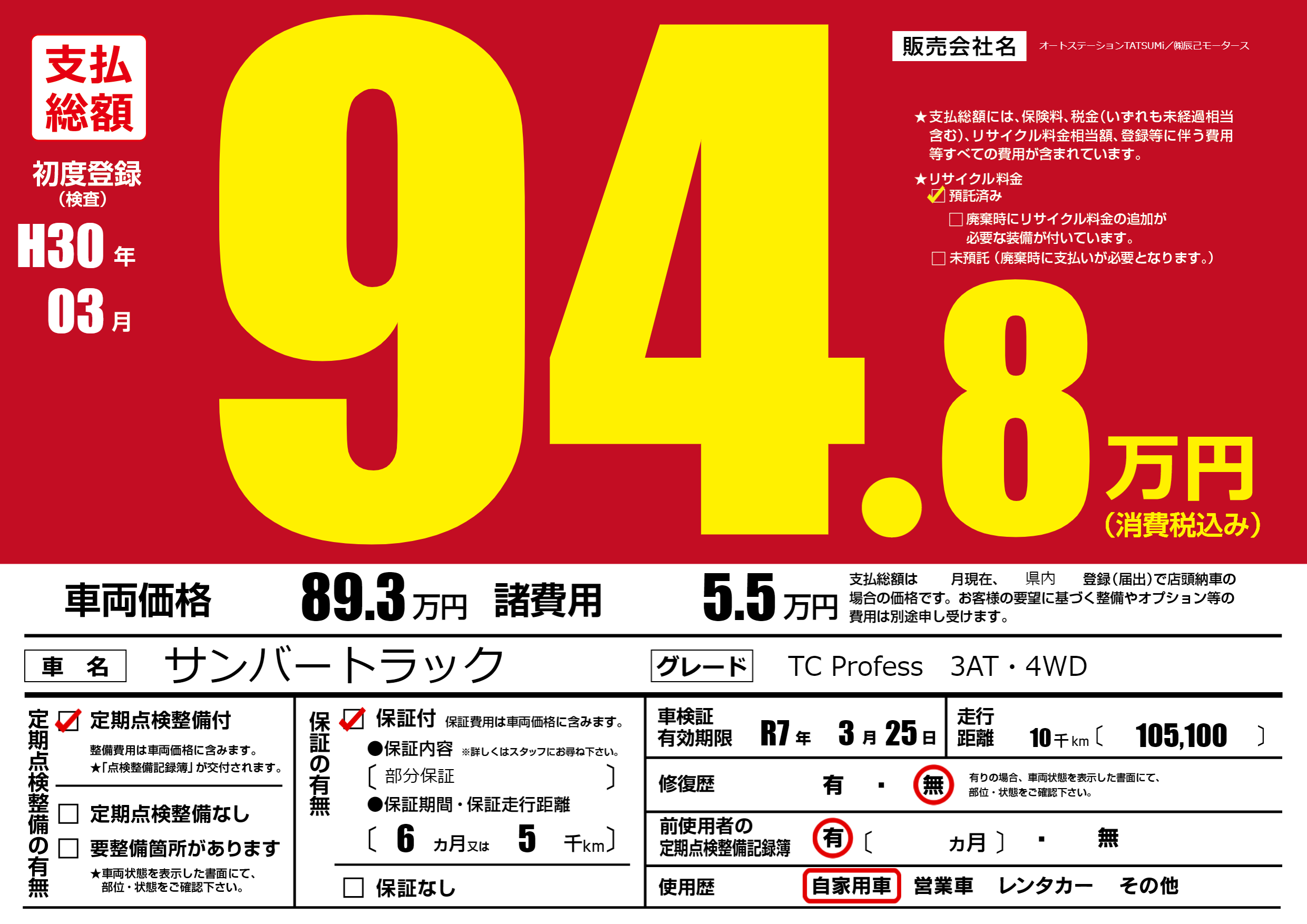 | 車名 | サンバートラック | グレード ミッション 排気量 |