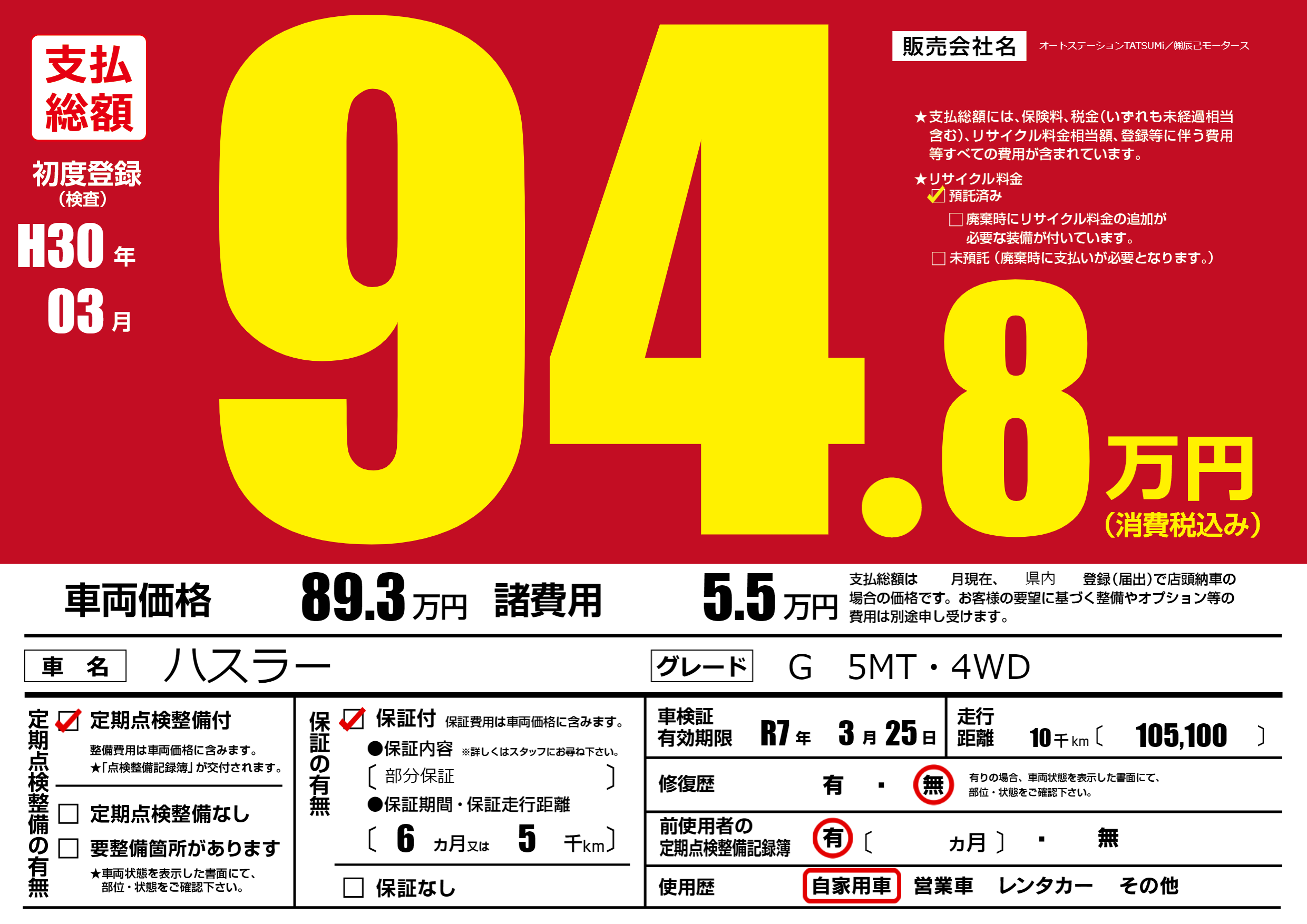| 車名 | ハスラー | グレード ミッション 排気量 |