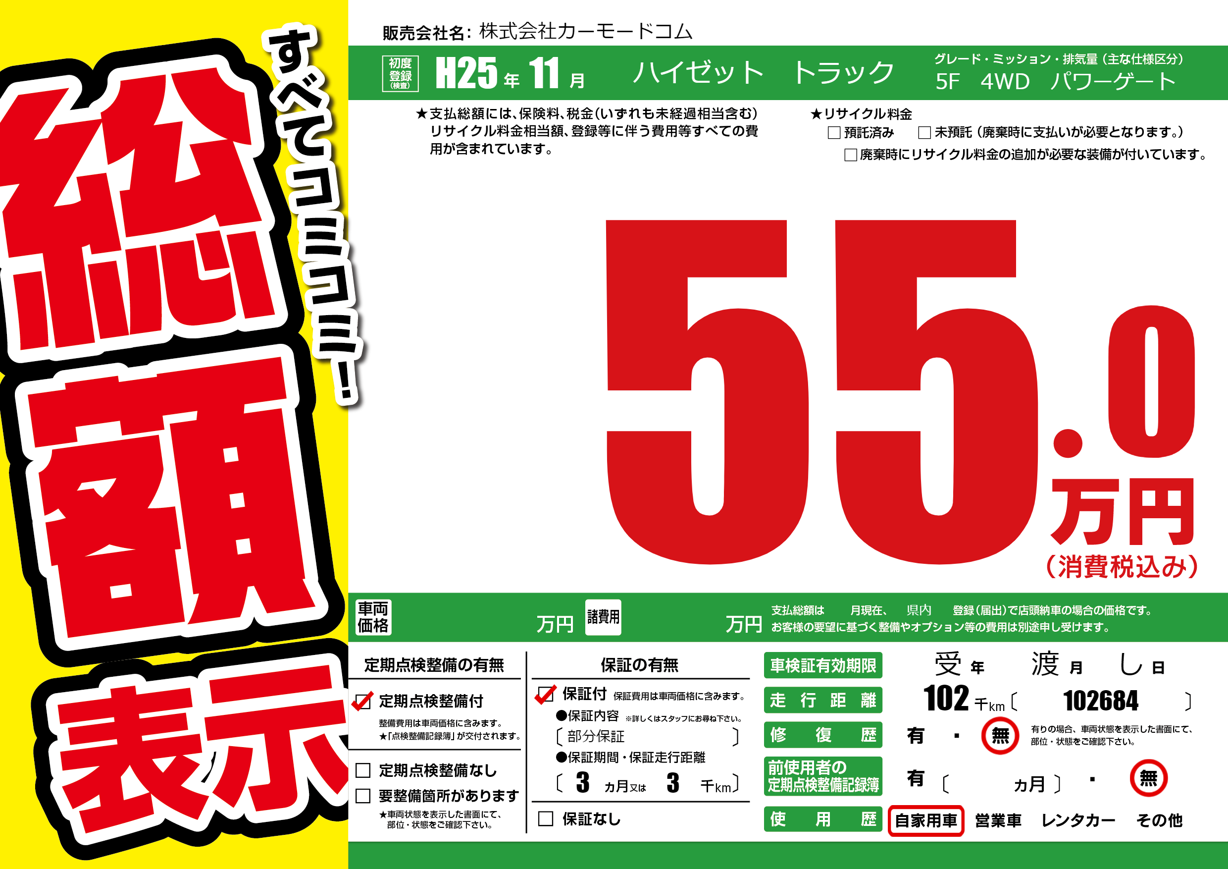 保証付き 保証内容(部分保証) 3ヶ月または(3)千kmまで |
