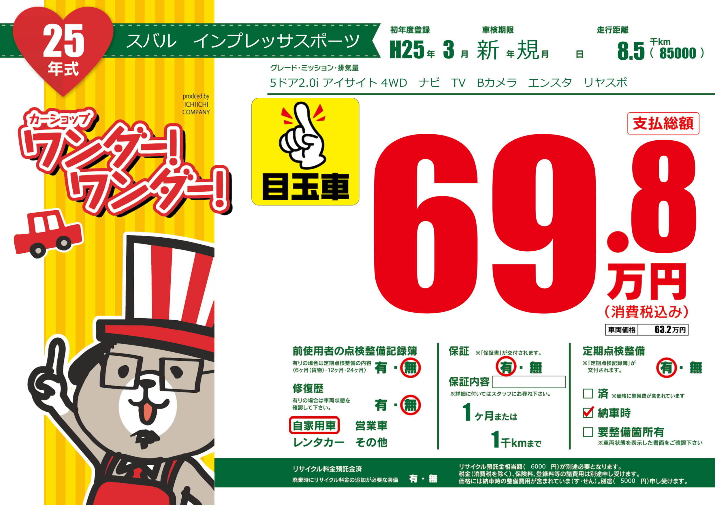 | 走行キロ | 0.8万km | 初年度登録 | H25年3月 |