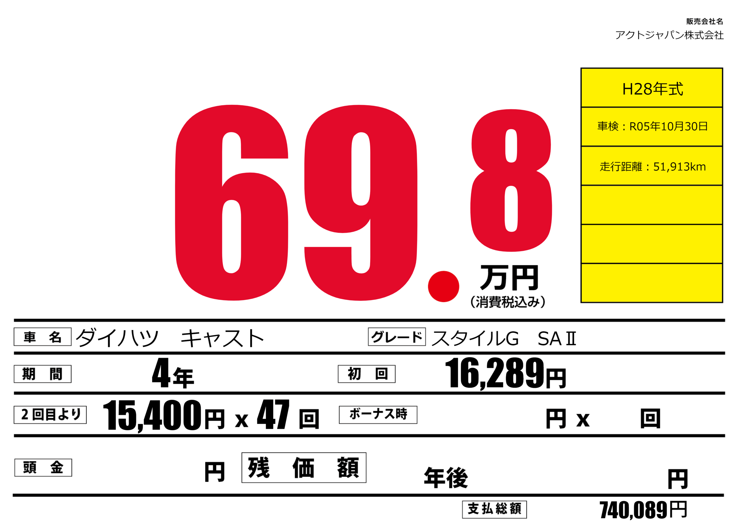 | 車名 | ダイハツ キャスト | グレード ミッション 排気量 |