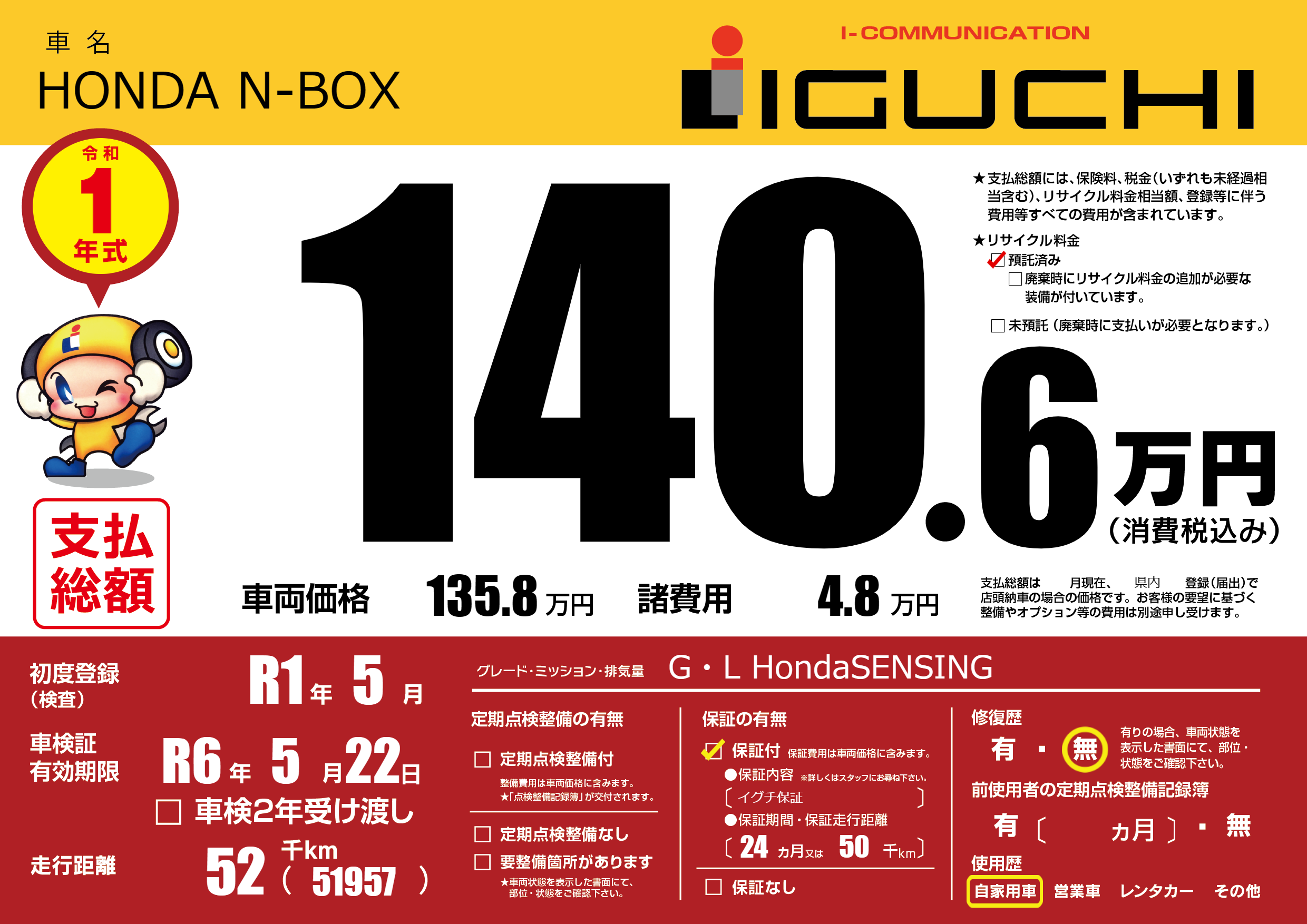 保証付き 保証内容(イグチ保証) 24ヶ月または(50)千kmまで |