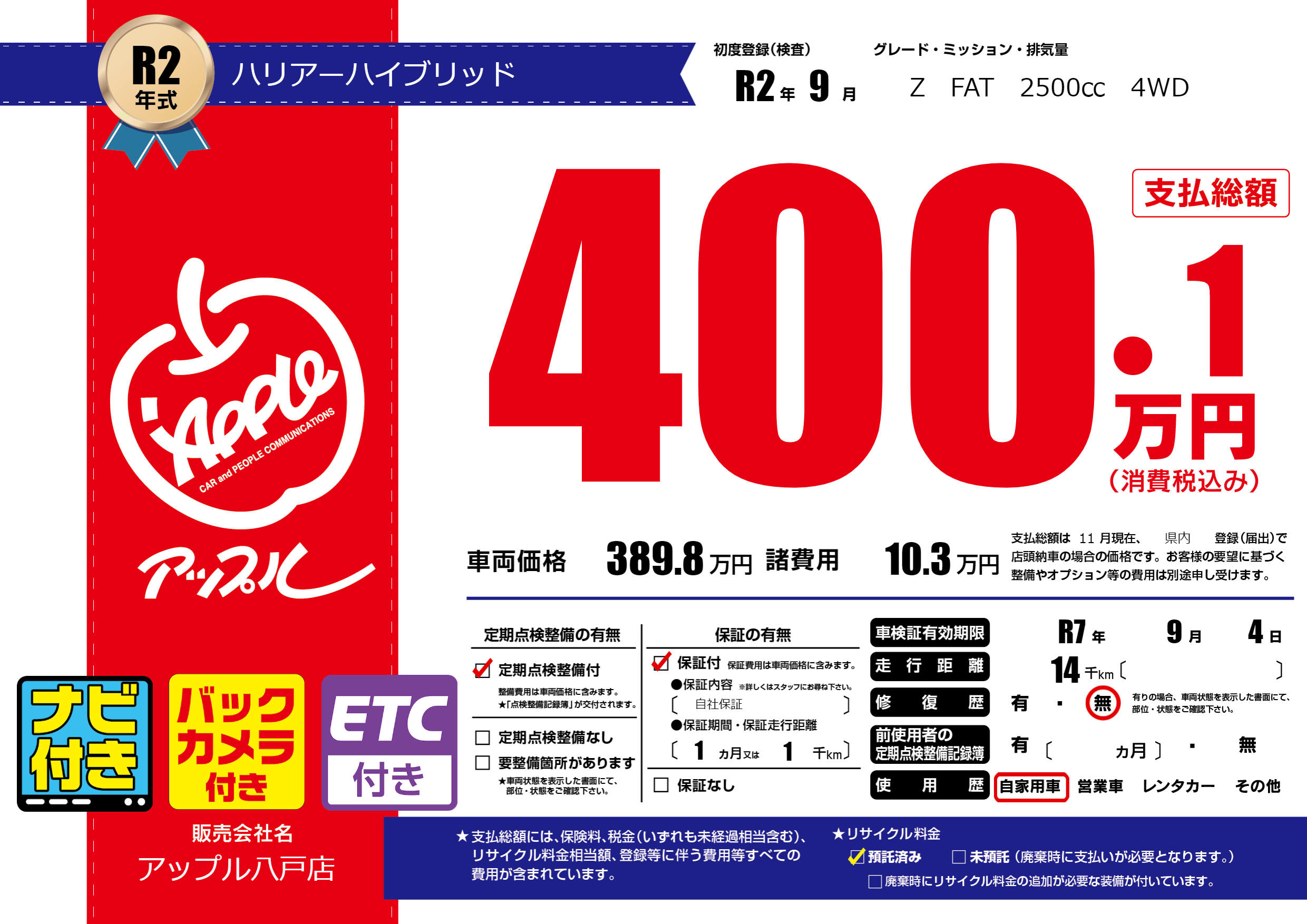 | 車検制限 | R7年 9月 4日 | ||