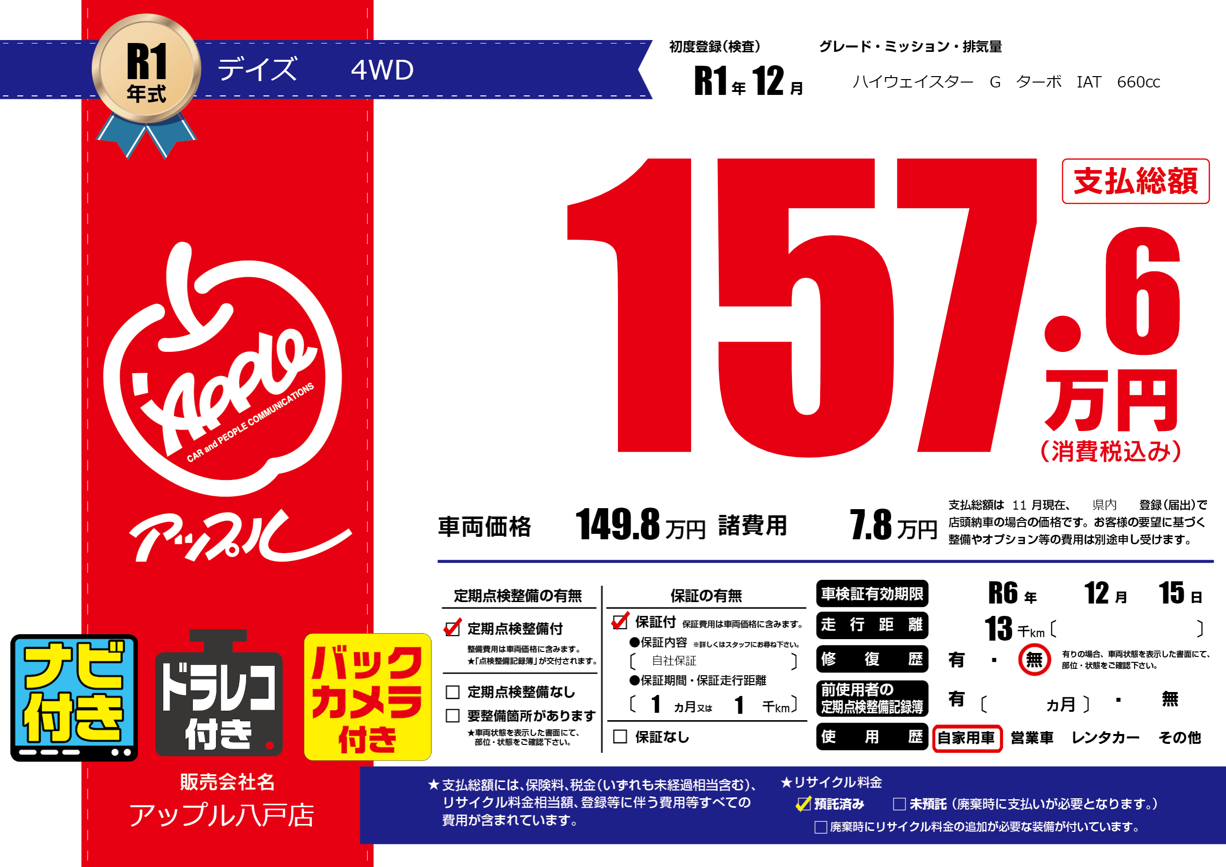 | 車検制限 | R6年 12月 15日 | ||