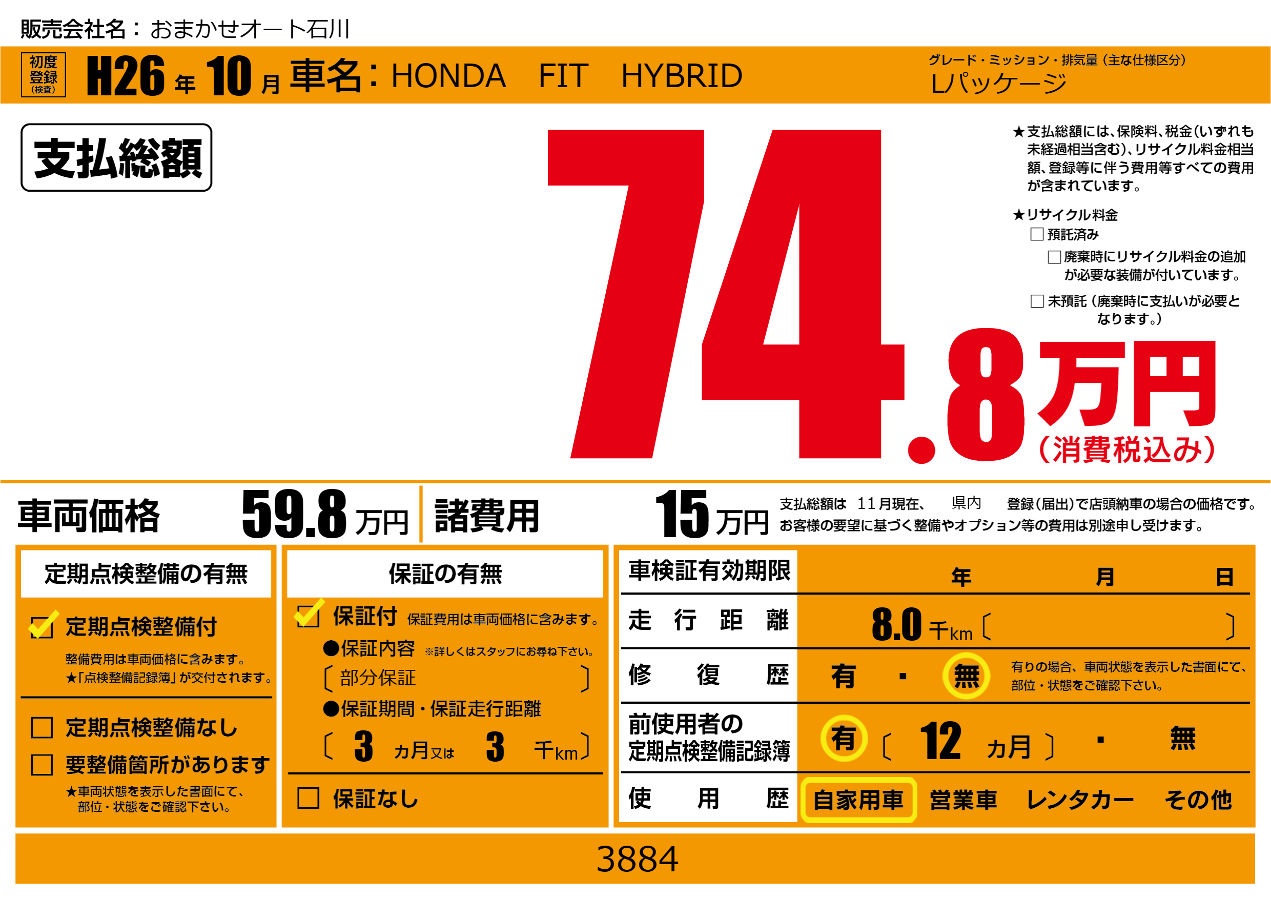 | 走行キロ | 0.8万km | 初年度登録 | H26年10月 |