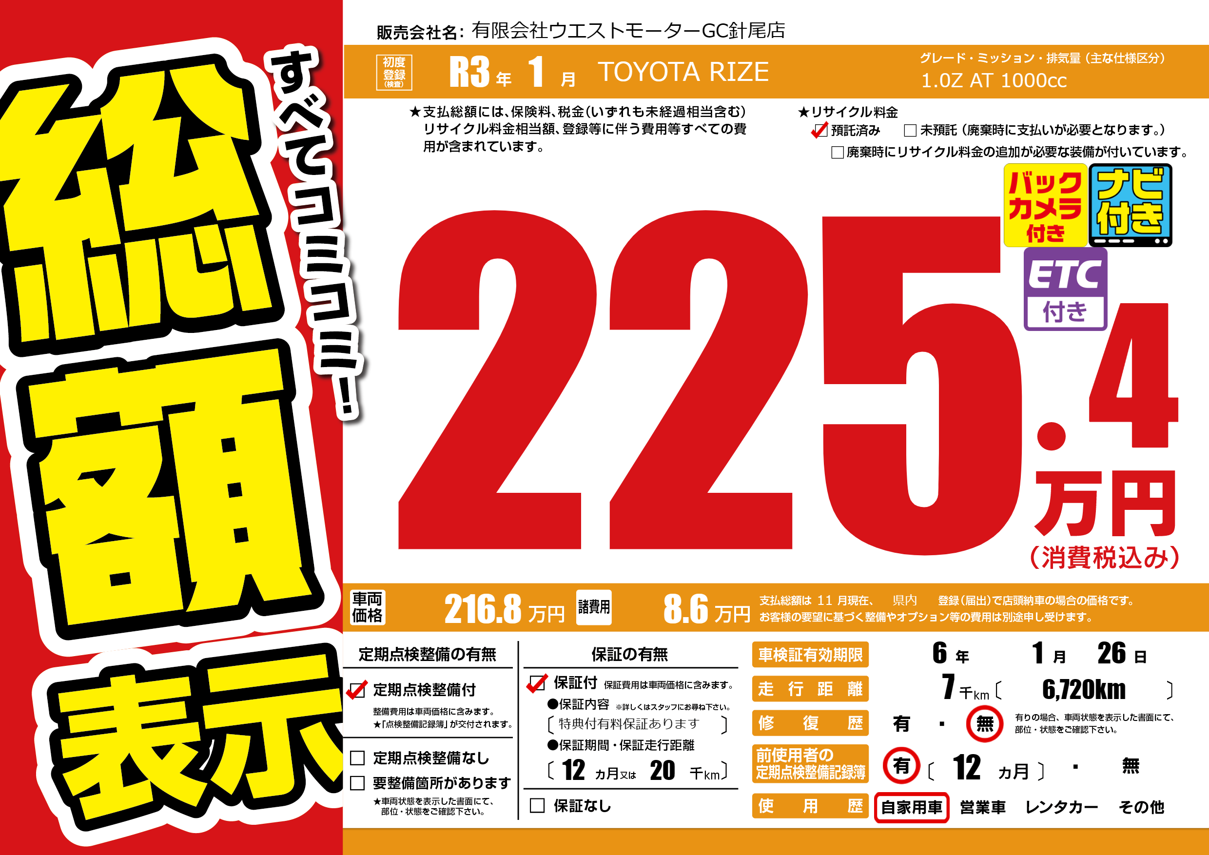 | 車名 | TOYOTA RIZE | グレード ミッション 排気量 |