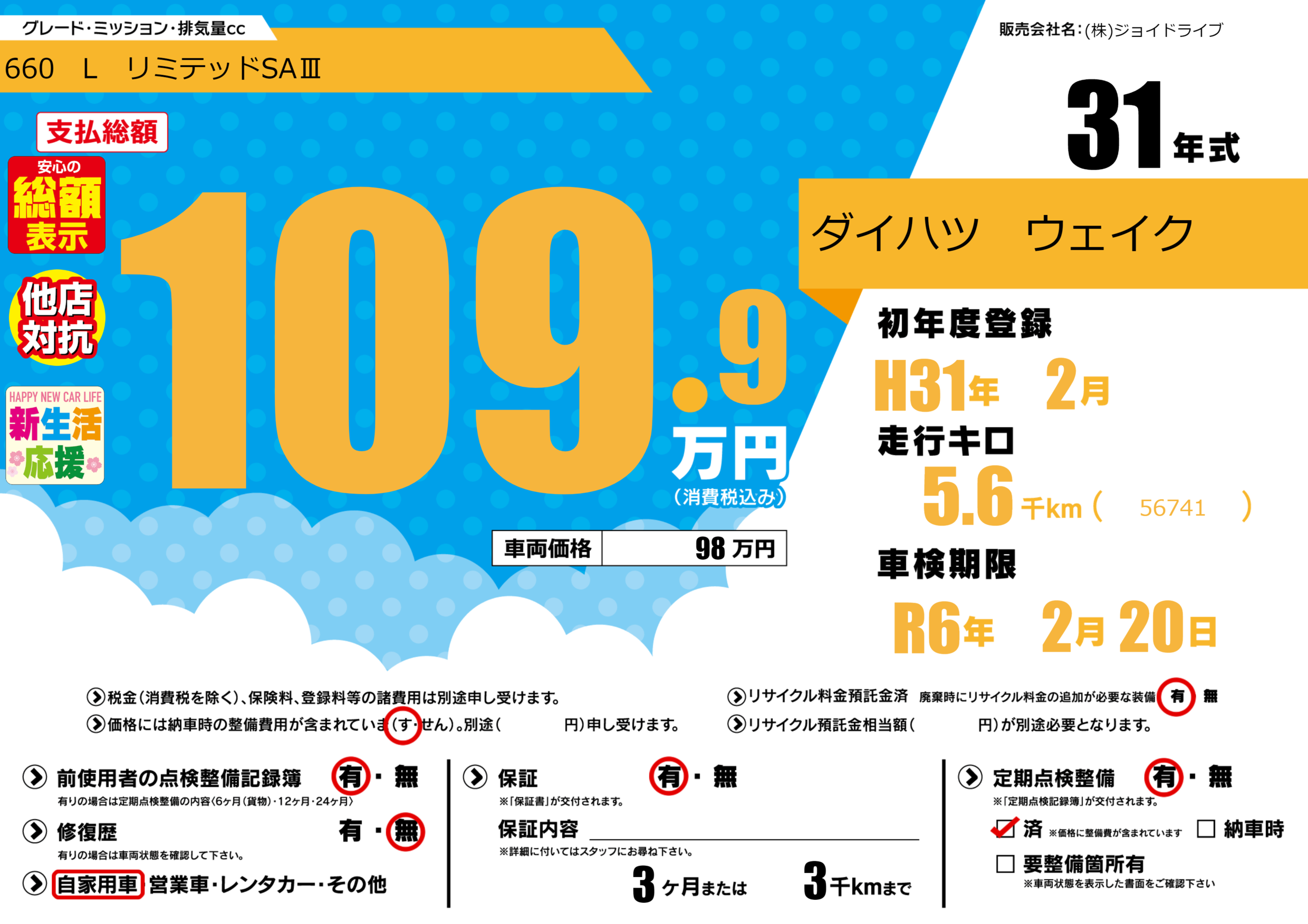 | 定期点検整備 | 定期点検整備あり 定期点検整備済み | ||