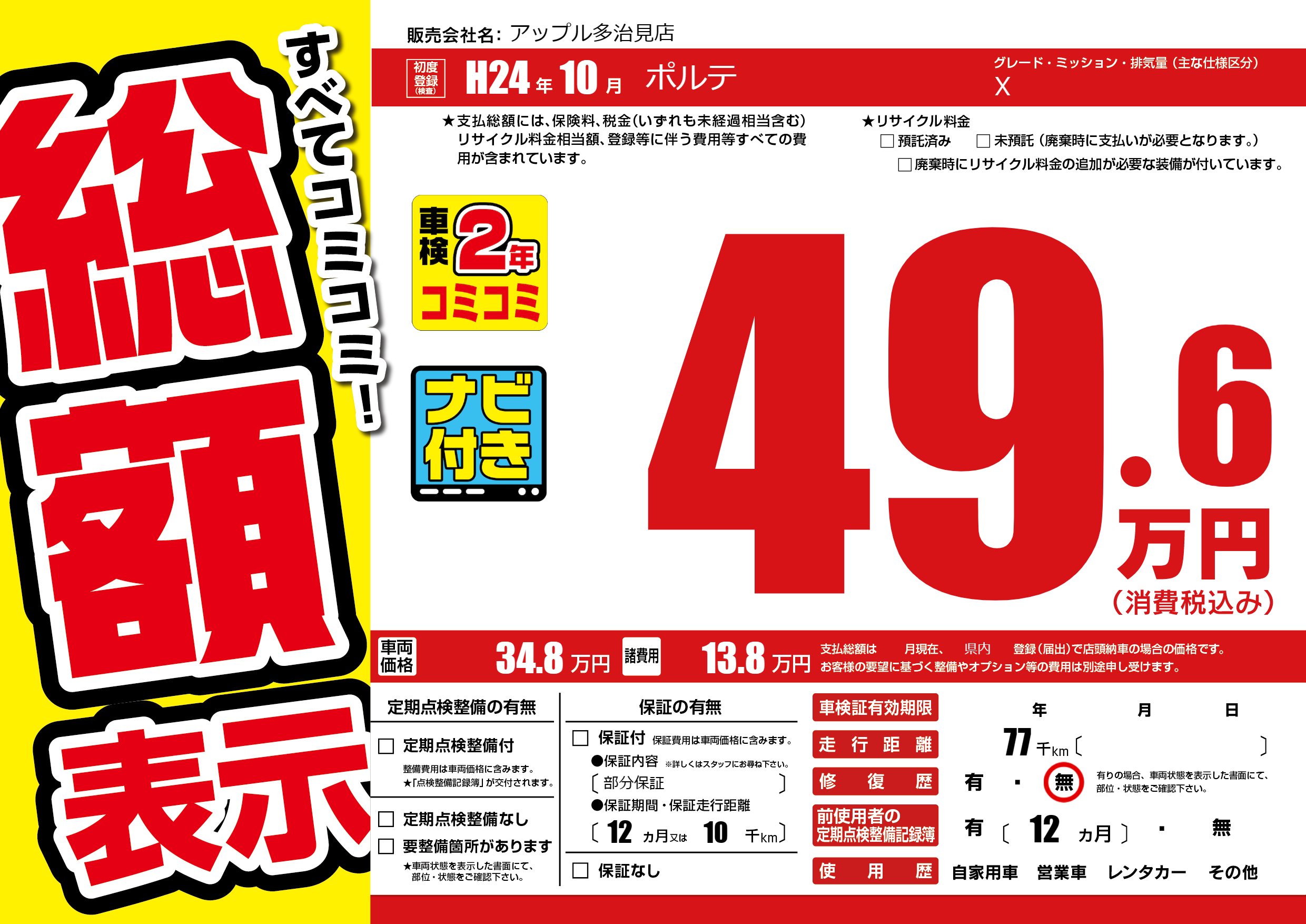 | 走行キロ | 7.7万km | 初年度登録 | H24年10月 |