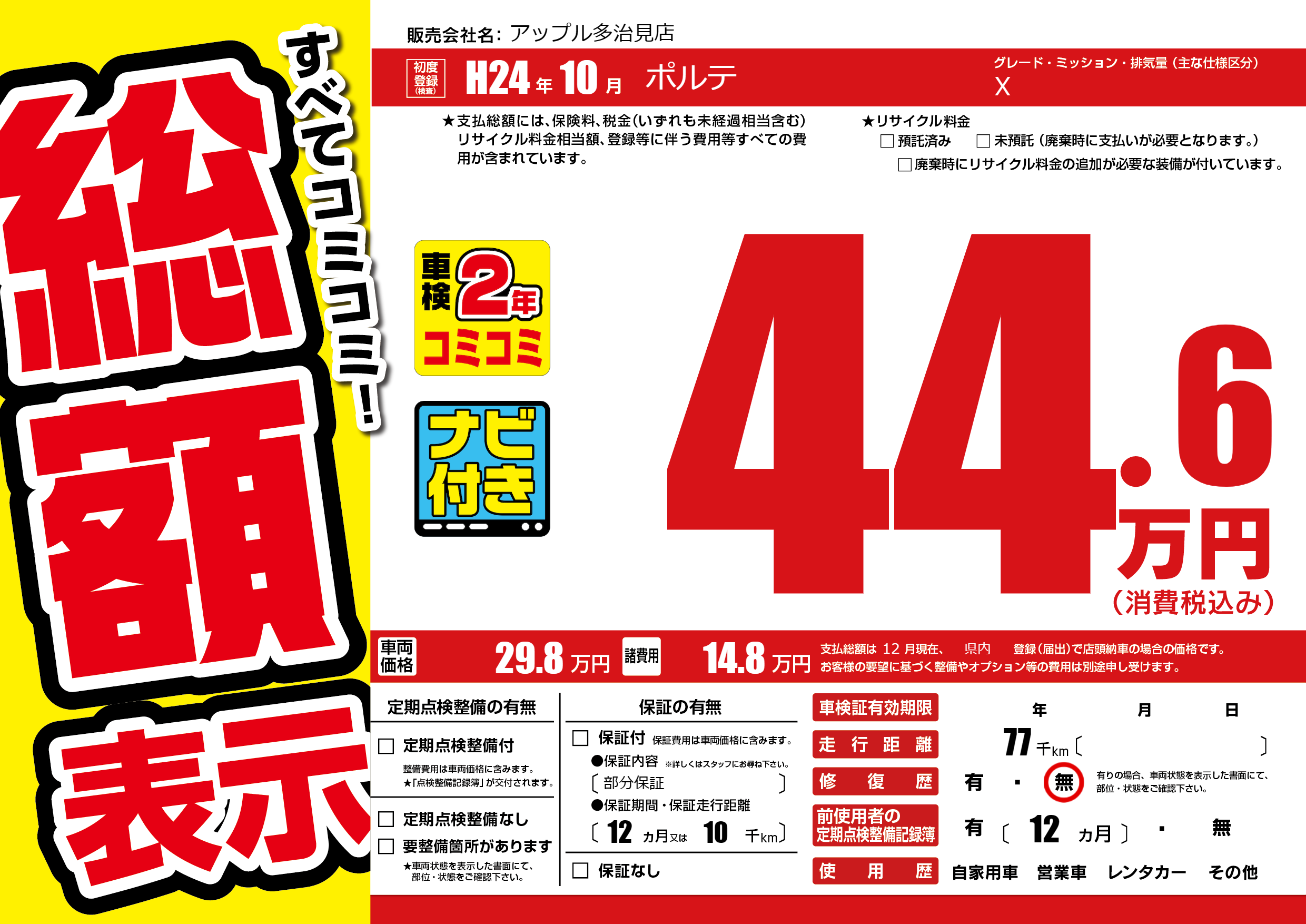 | 走行キロ | 7.7万km | 初年度登録 | H24年10月 |