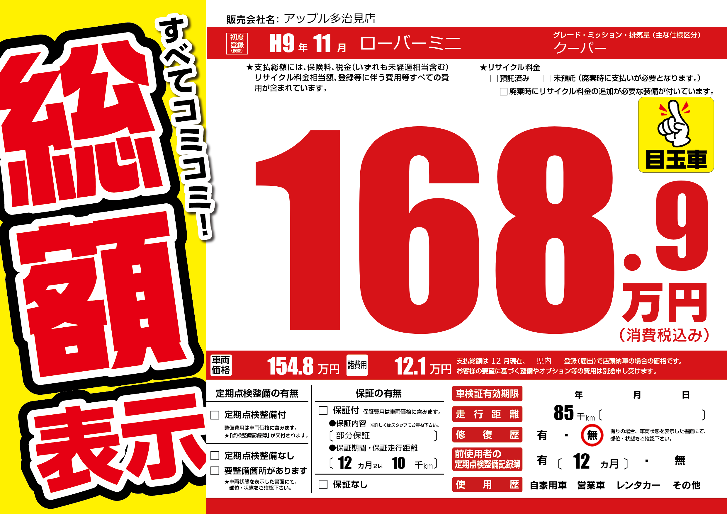 | 走行キロ | 8.5万km | 初年度登録 | H9年11月 |