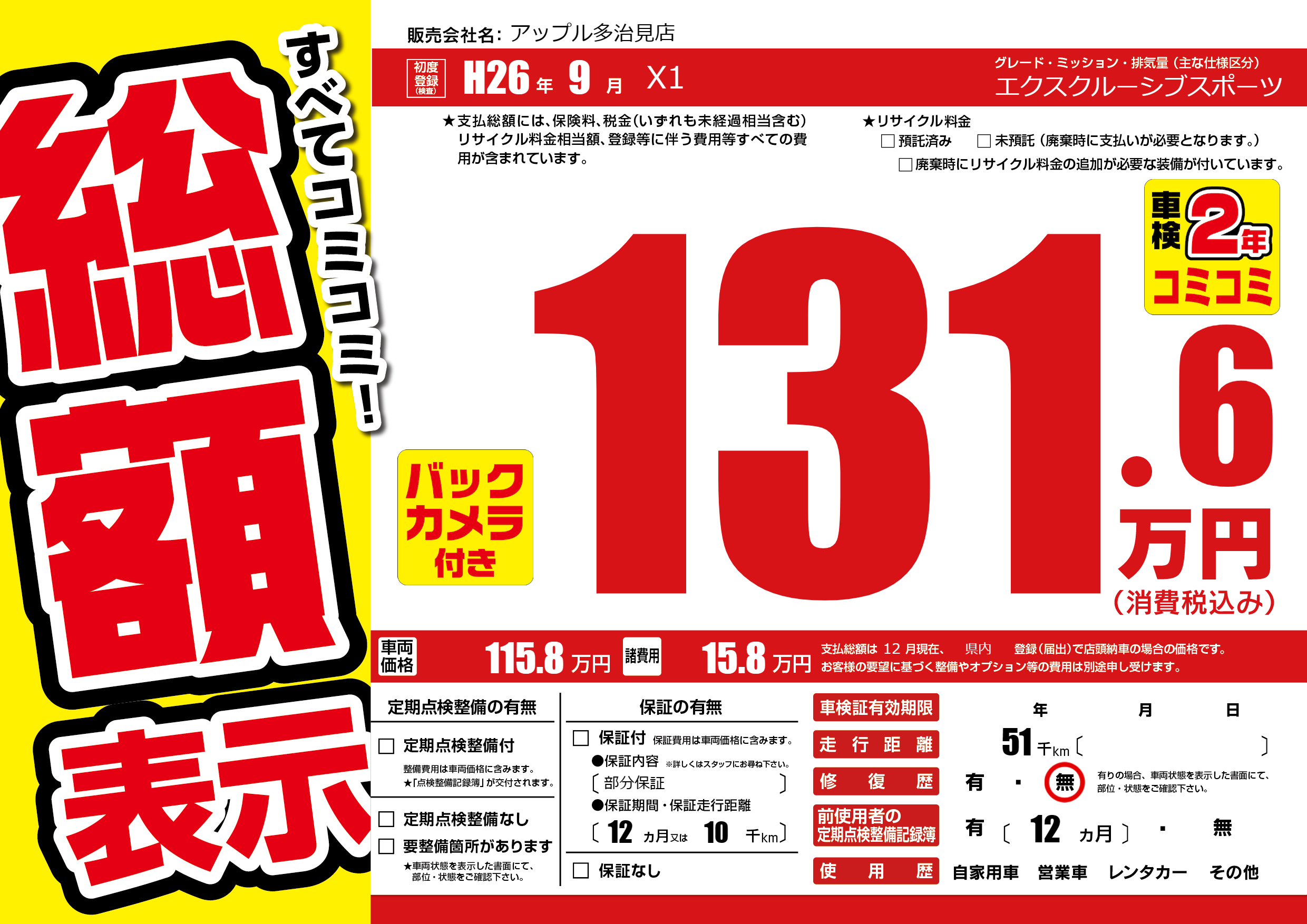 | 走行キロ | 5.1万km | 初年度登録 | H26年9月 |