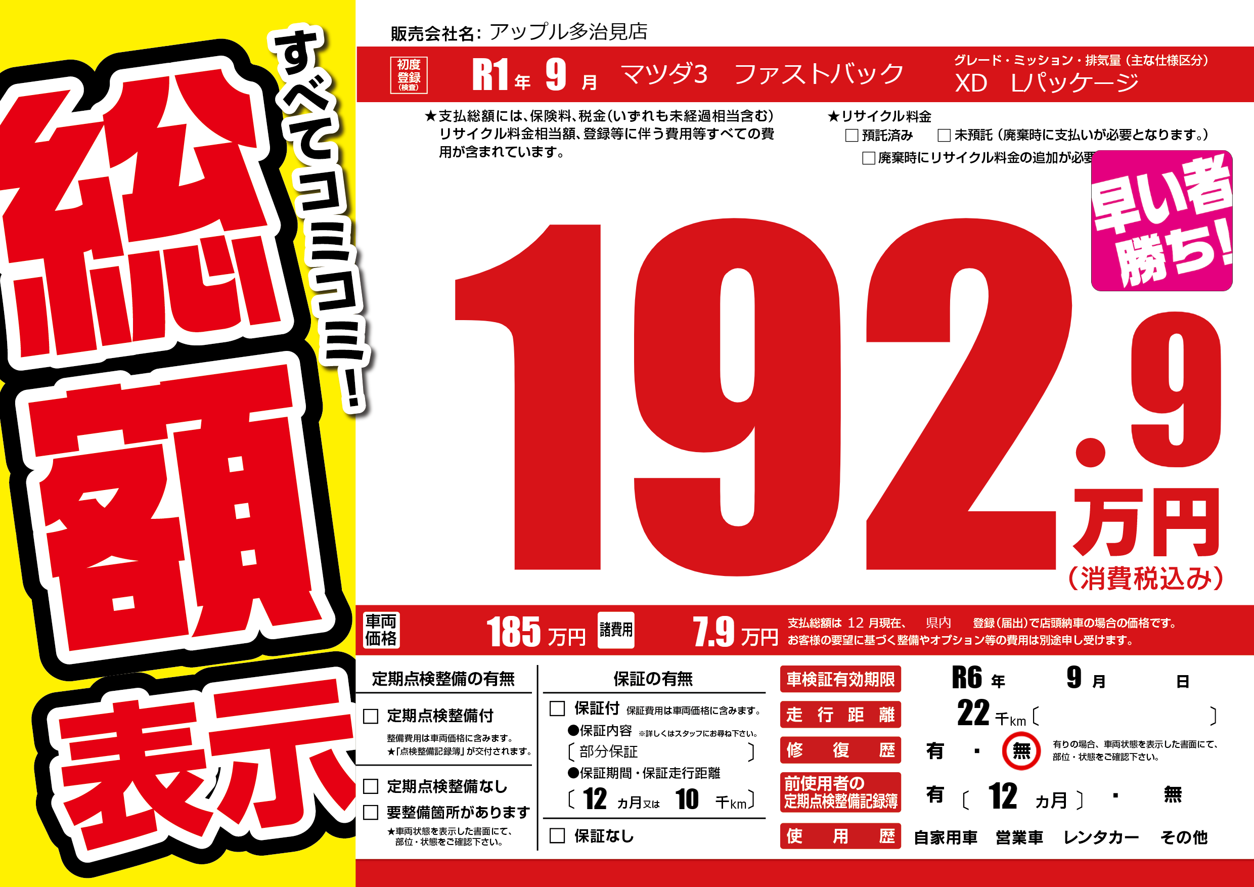 | 車名 | マツダ3 ファストバック | グレード ミッション 排気量 |