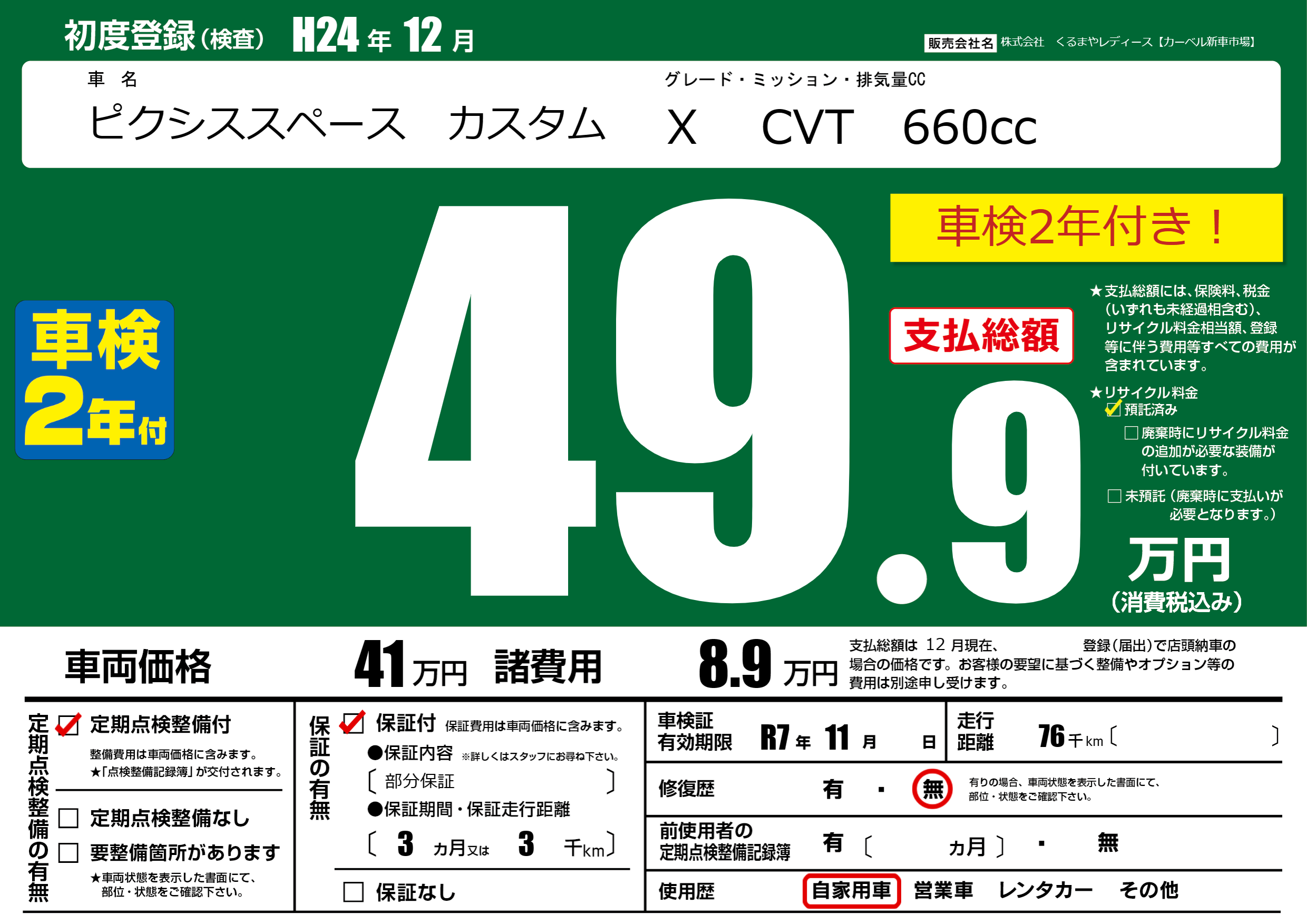 | 走行キロ | 7.6万km | 初年度登録 | H24年12月 |