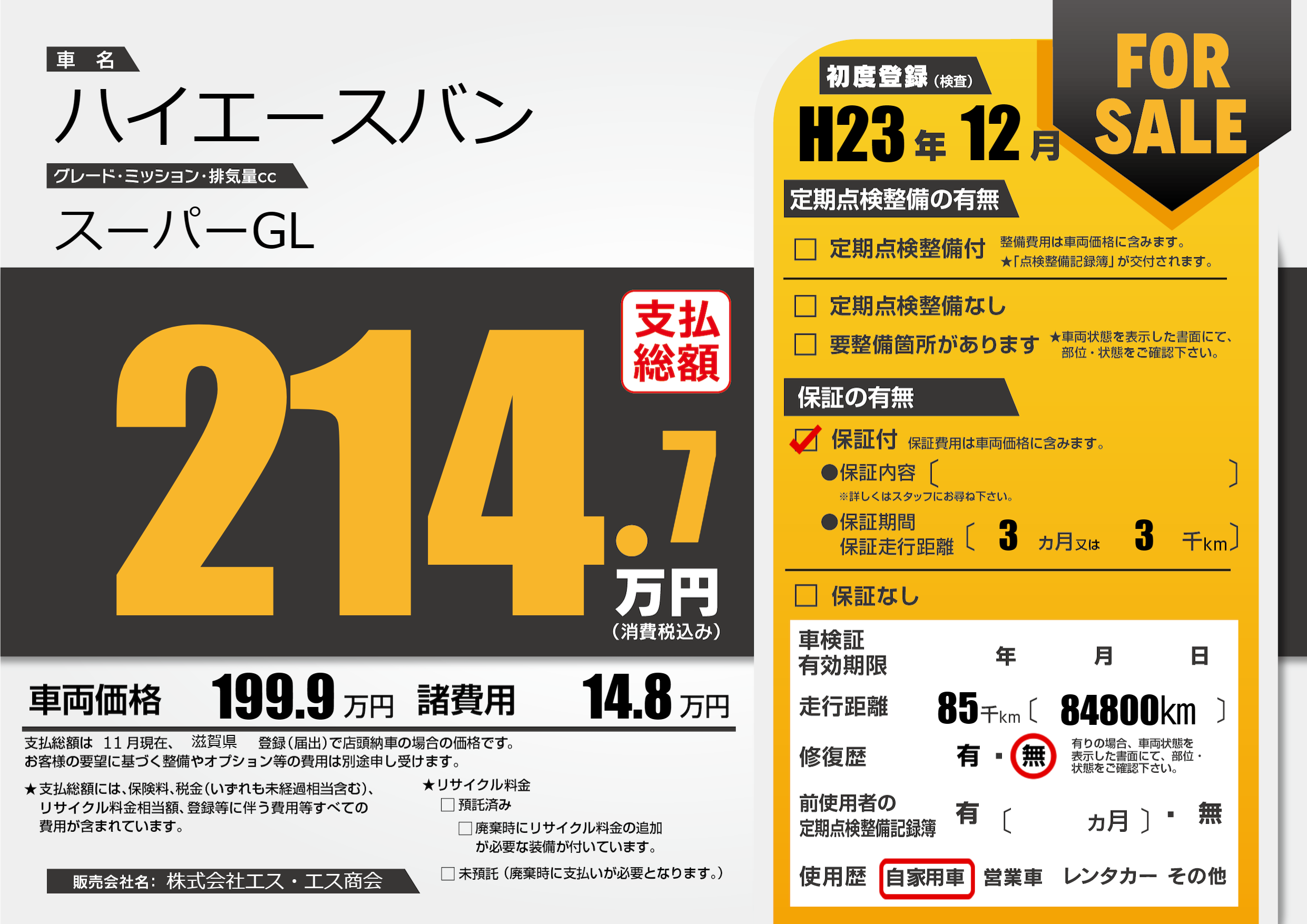 | 車名 | ハイエースバン | グレード ミッション 排気量 |