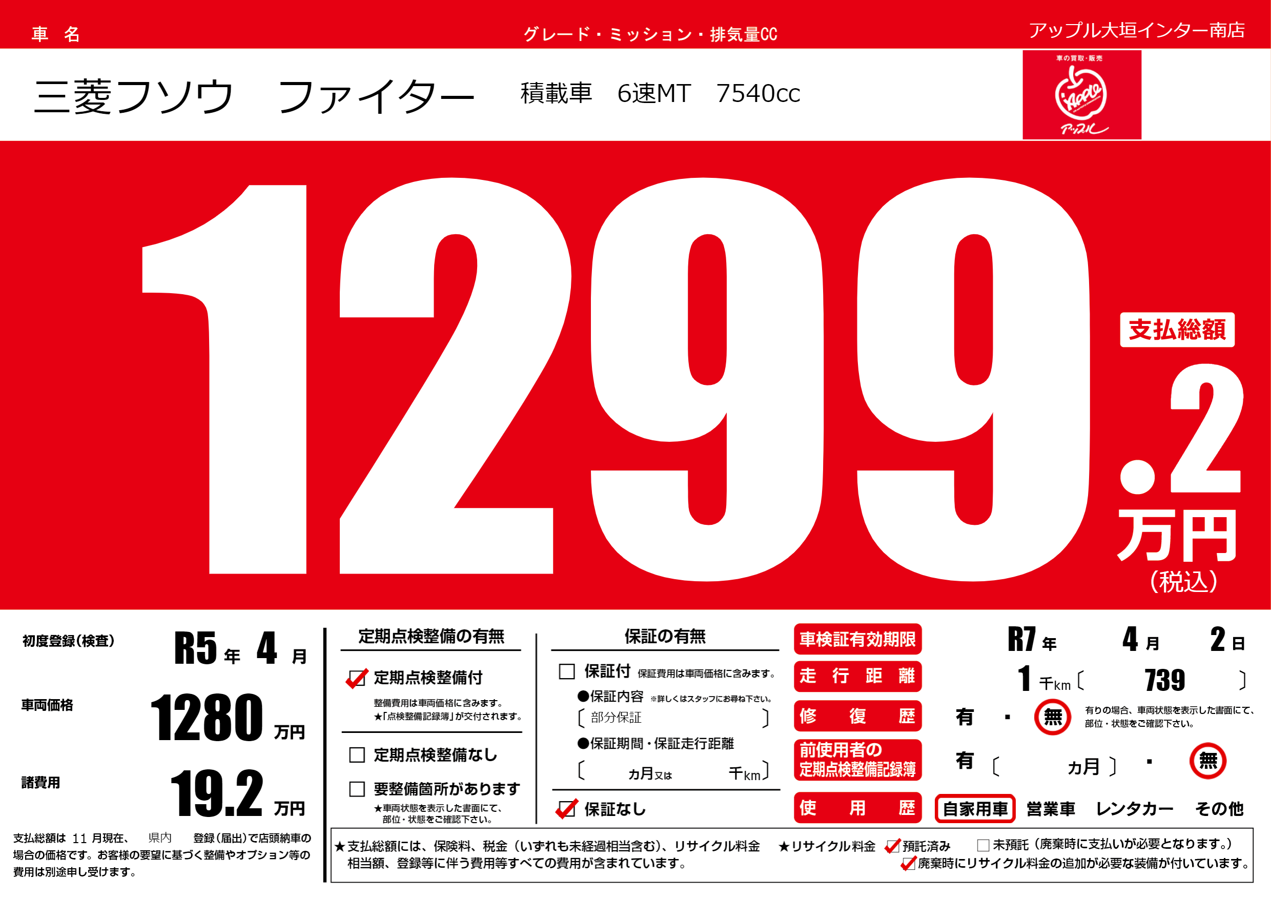 | 車名 | 三菱フソウ ファイター | グレード ミッション 排気量 |