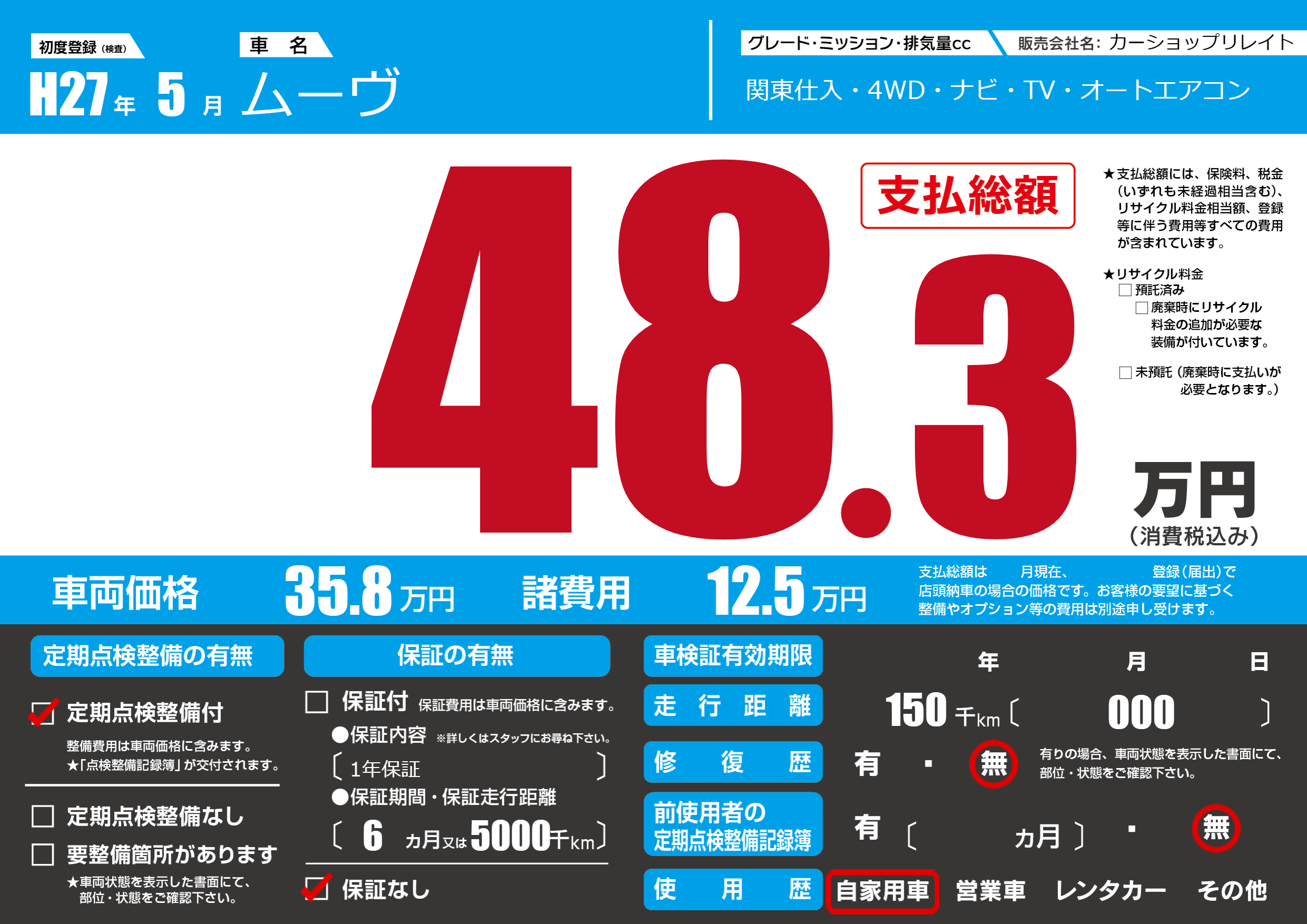 | 走行キロ | 15万km | 初年度登録 | H27年5月 |
