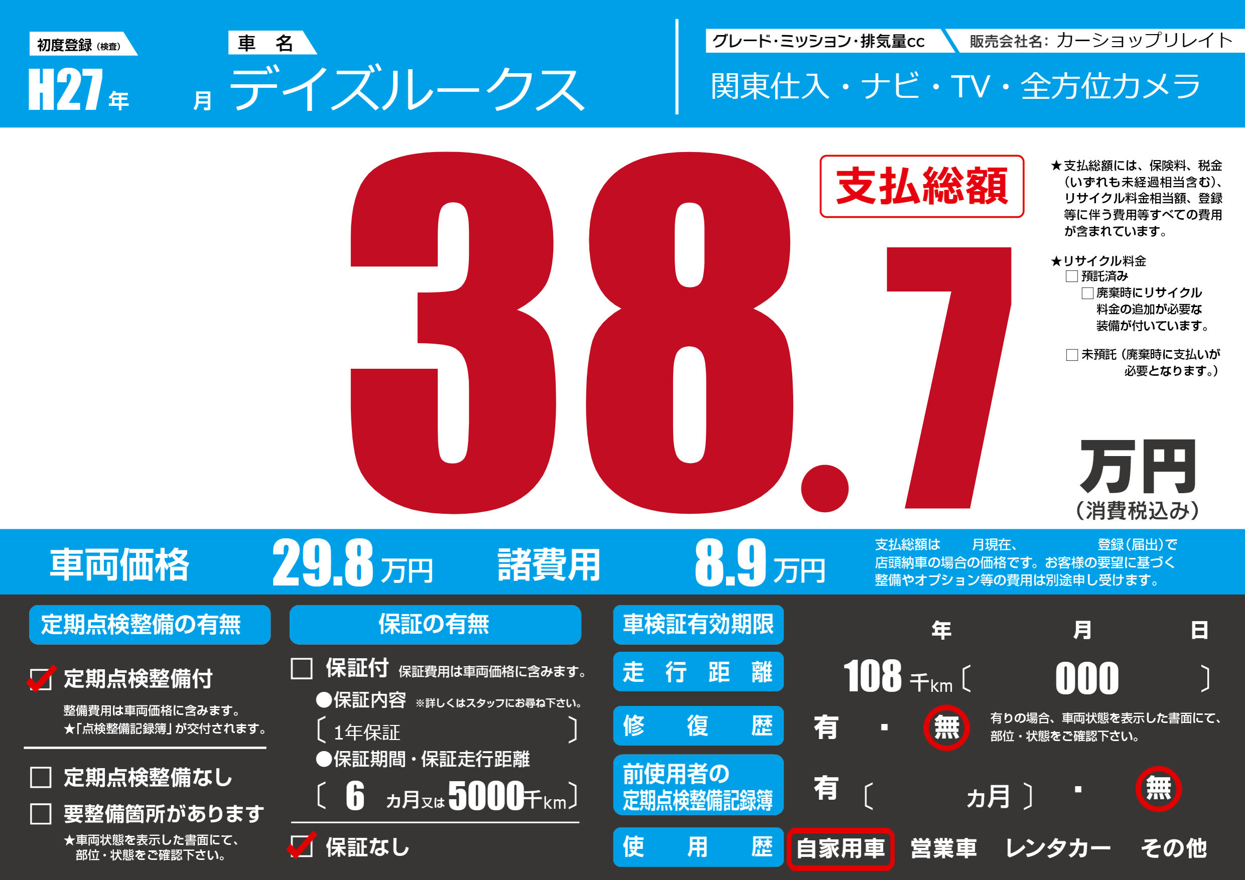 | 車名 | デイズルークス | グレード ミッション 排気量 |