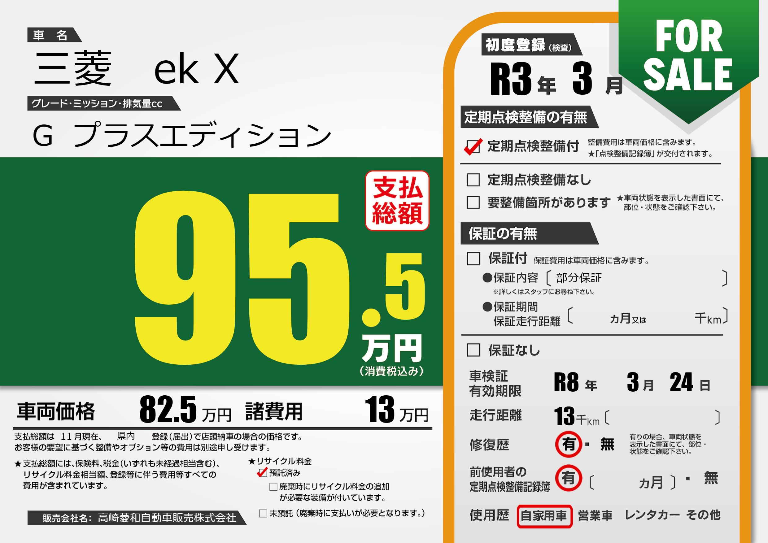 | 車名 | 三菱 ek X | グレード ミッション 排気量 |