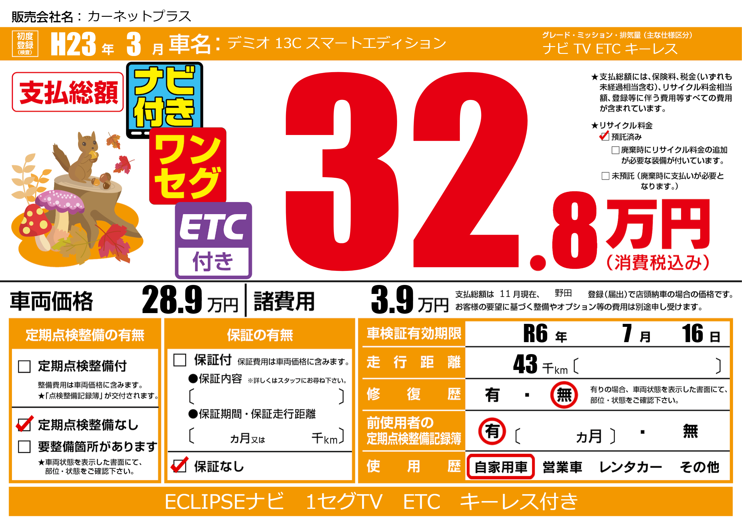 | 車名 | デミオ 13C スマートエディション | グレード ミッション 排気量 |