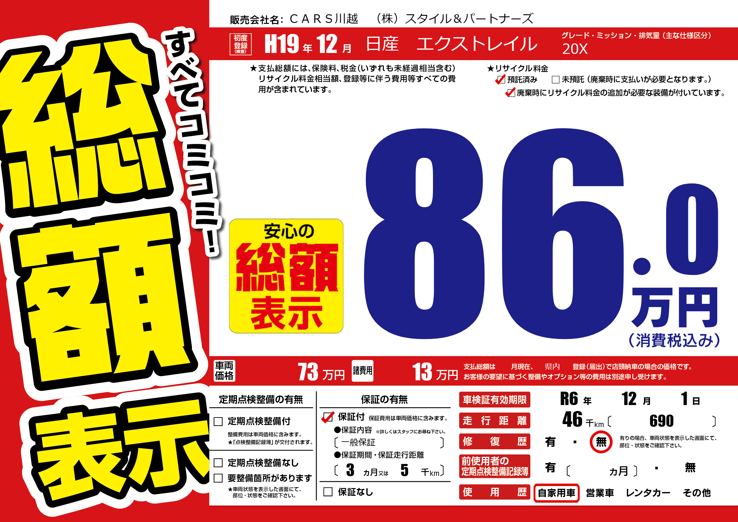 | 走行キロ | 4.6万km | 初年度登録 | H19年12月 |