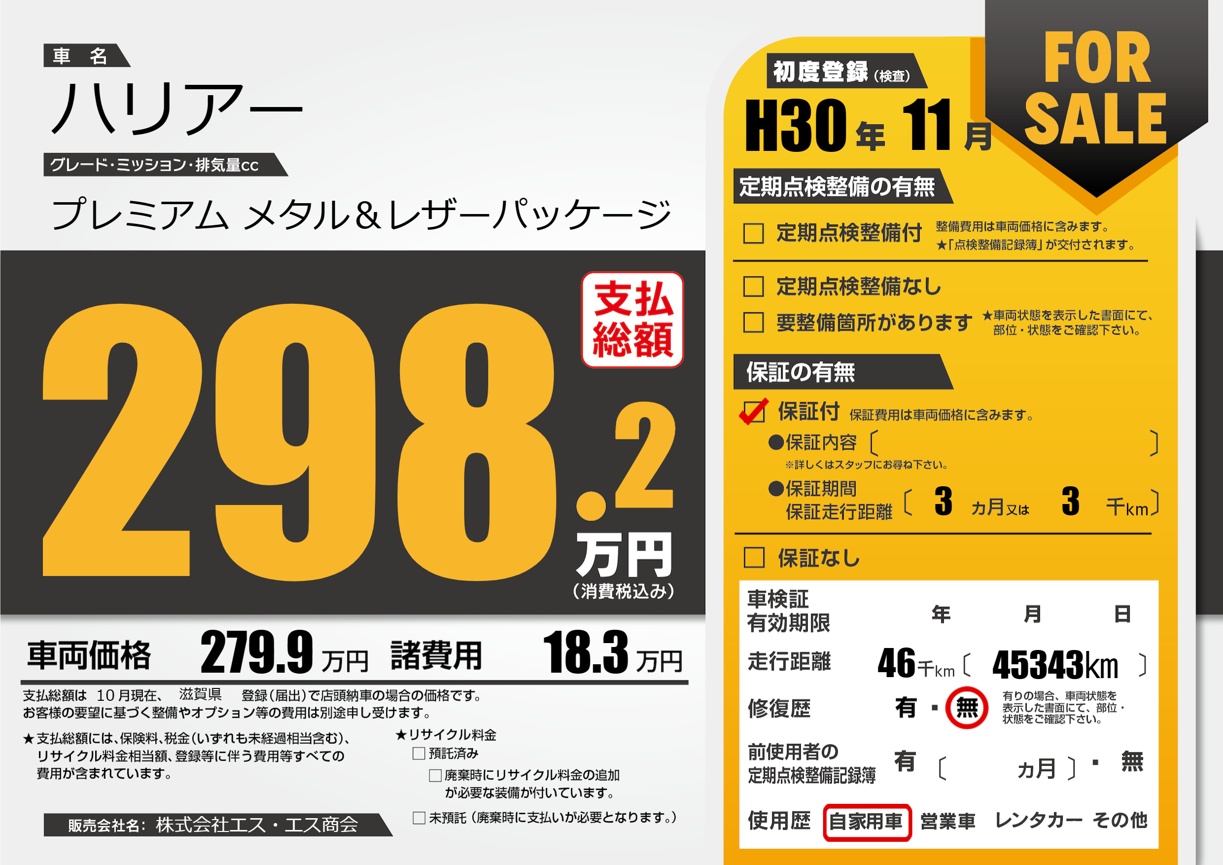 | 走行キロ | 4.6万km | 初年度登録 | H30年11月 |