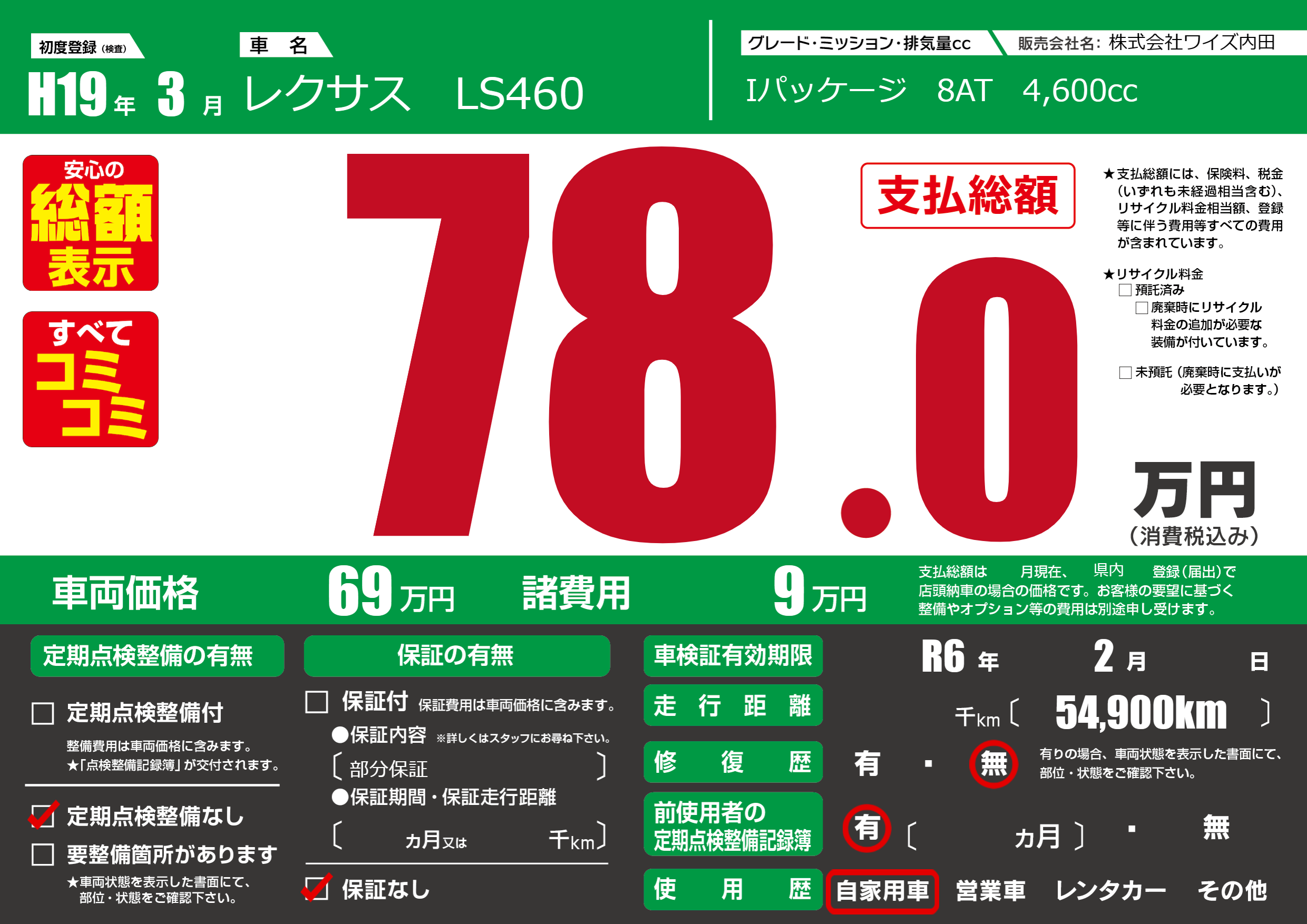 | 車名 | レクサス LS460 | グレード ミッション 排気量 |