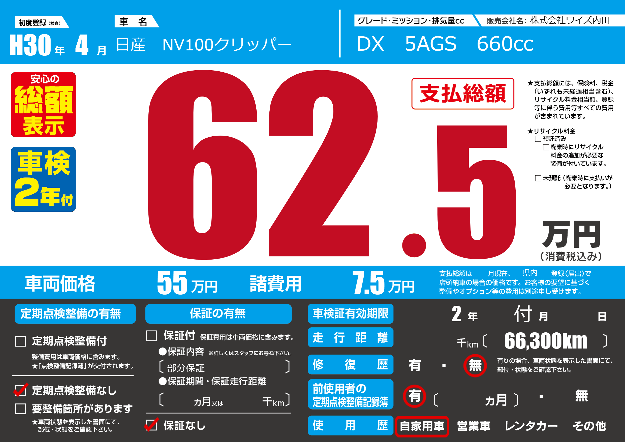 | 車名 | 日産 NV100クリッパー | グレード ミッション 排気量 |