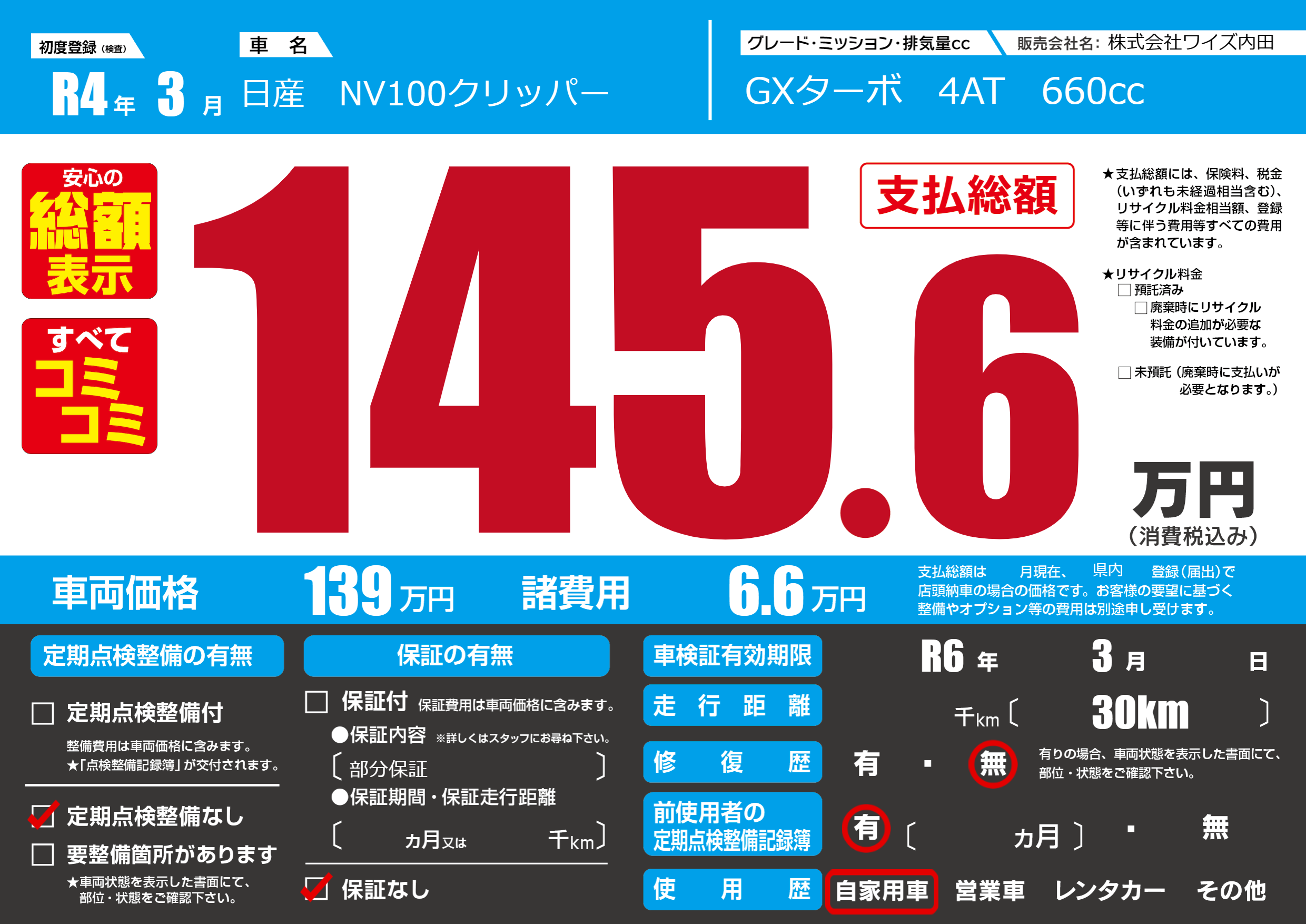 なし | 車検制限 | R6年3月---月 |