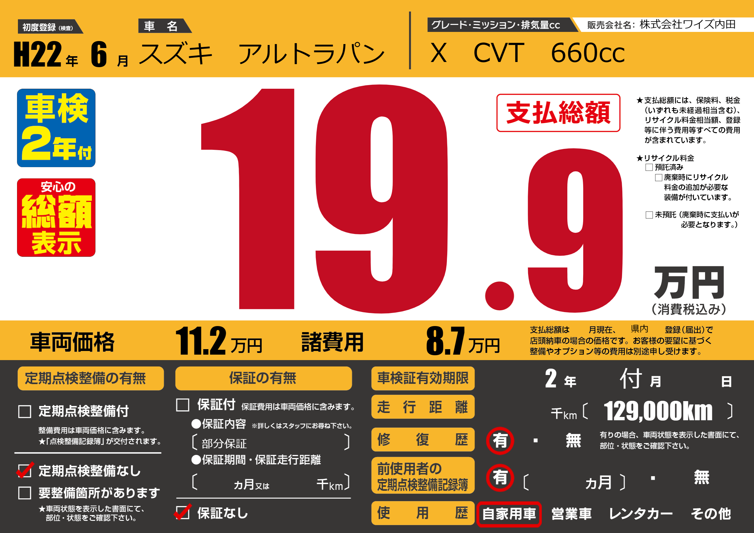 | 車名 | スズキ アルトラパン | グレード ミッション 排気量 |