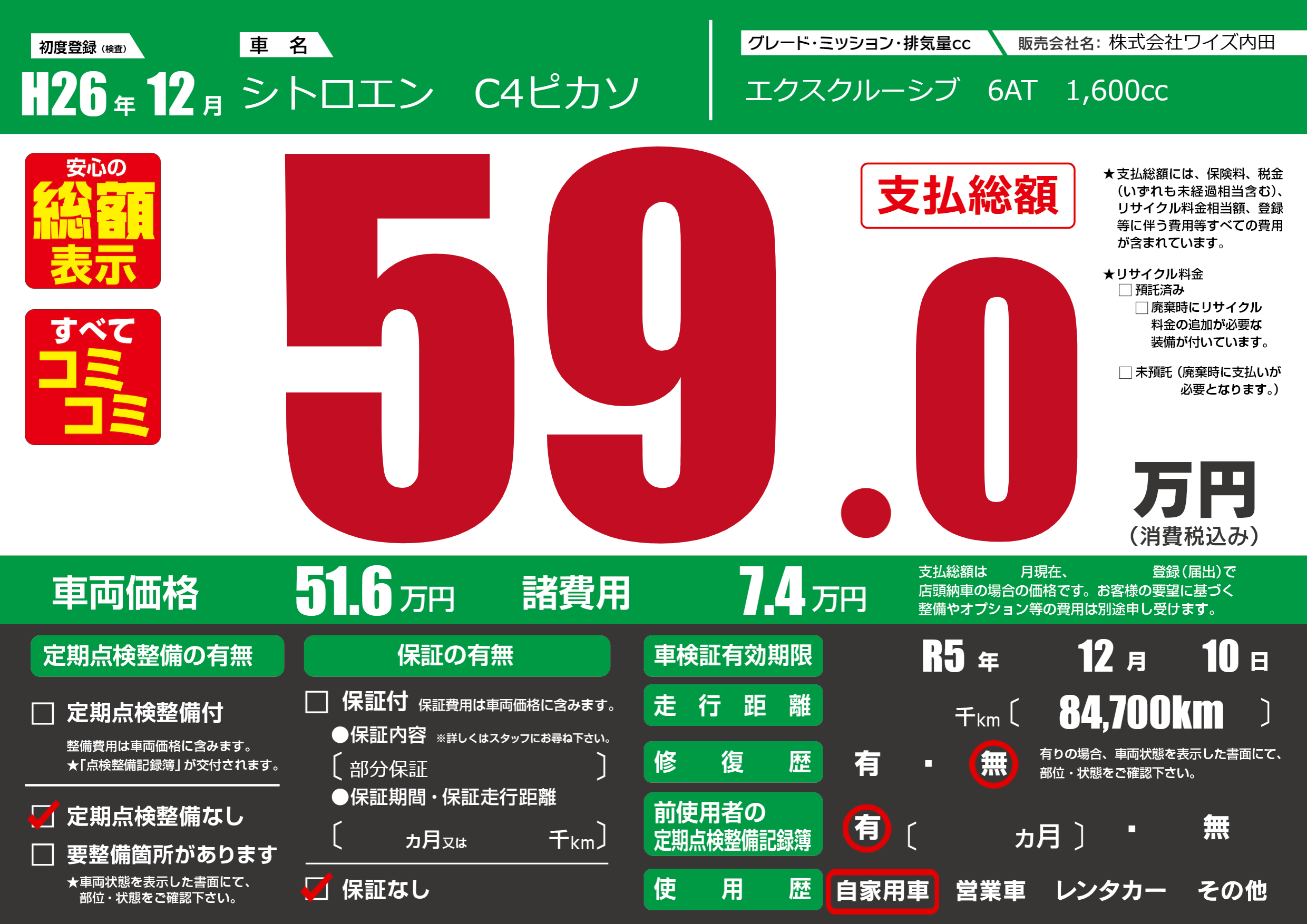 | 車名 | シトロエン C4ピカソ | グレード ミッション 排気量 |