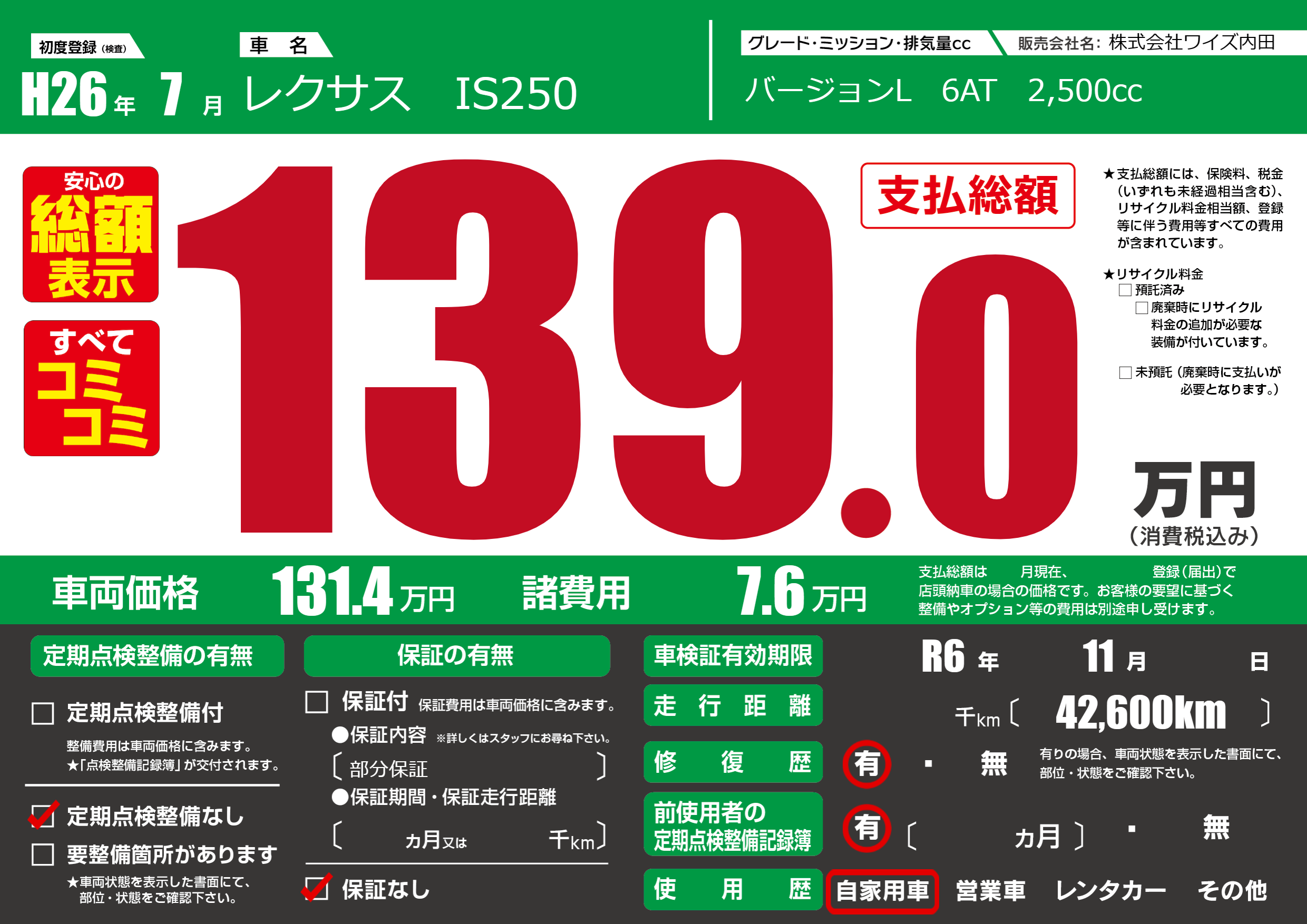 なし | 車検制限 | R6年11月---月 |