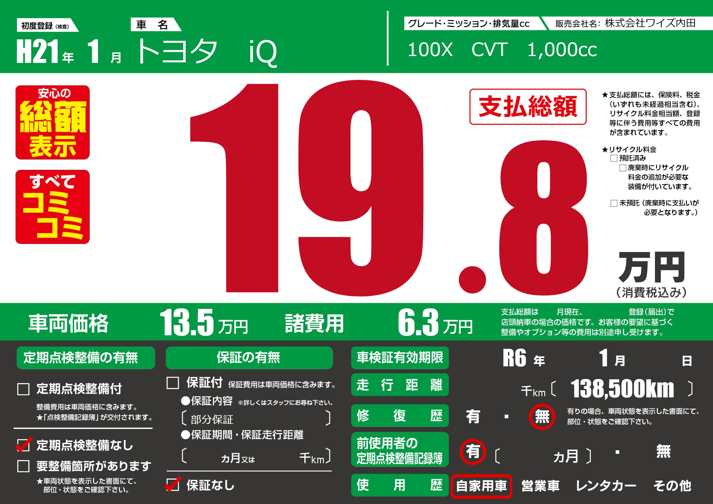 なし | 車検制限 | R6年1月---月 |