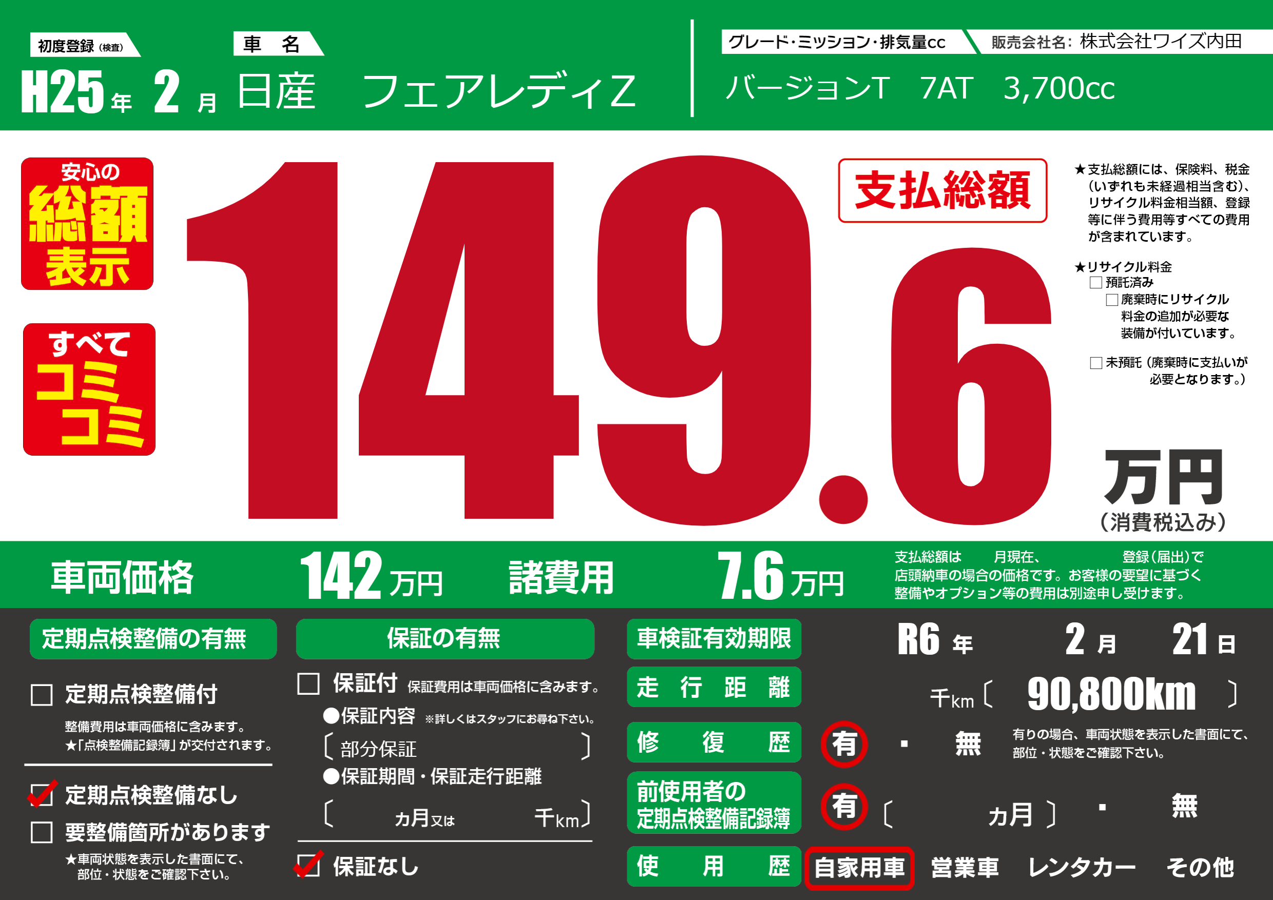 | 車名 | 日産 フェアレディZ | グレード ミッション 排気量 |