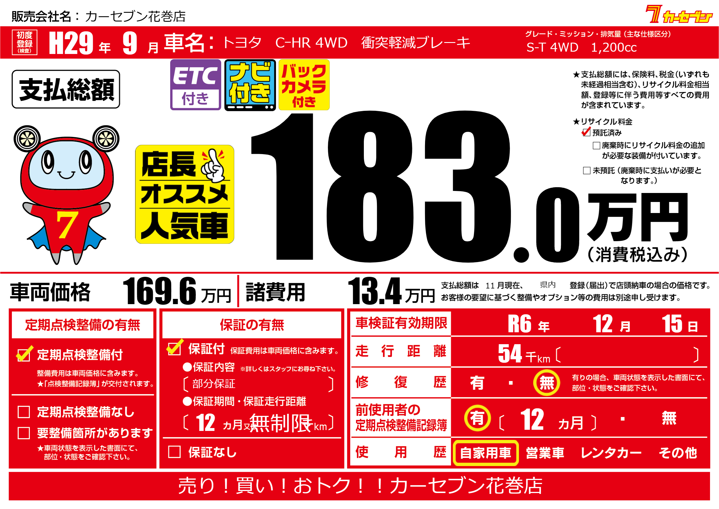 | 車名 | トヨタ CーHR 4WD 衝突軽減ブレーキ | グレード ミッション 排気量 |