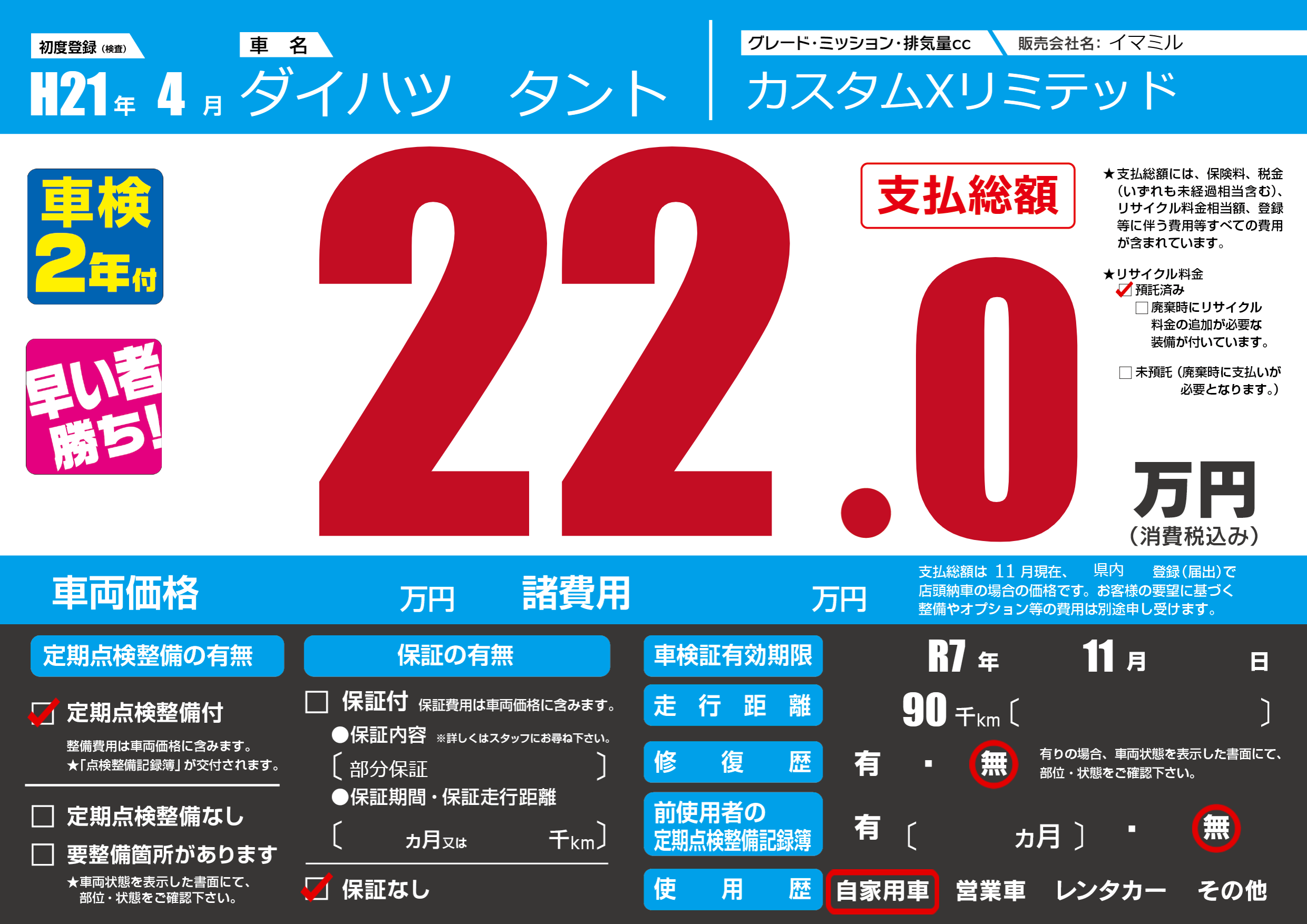 | 車名 | ダイハツ タント | グレード ミッション 排気量 |