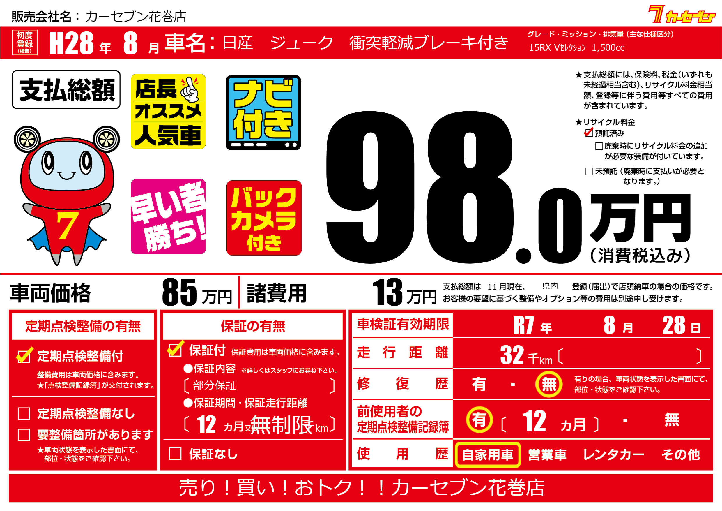 | 走行キロ | 3.2万km | 初年度登録 | H28年8月 |