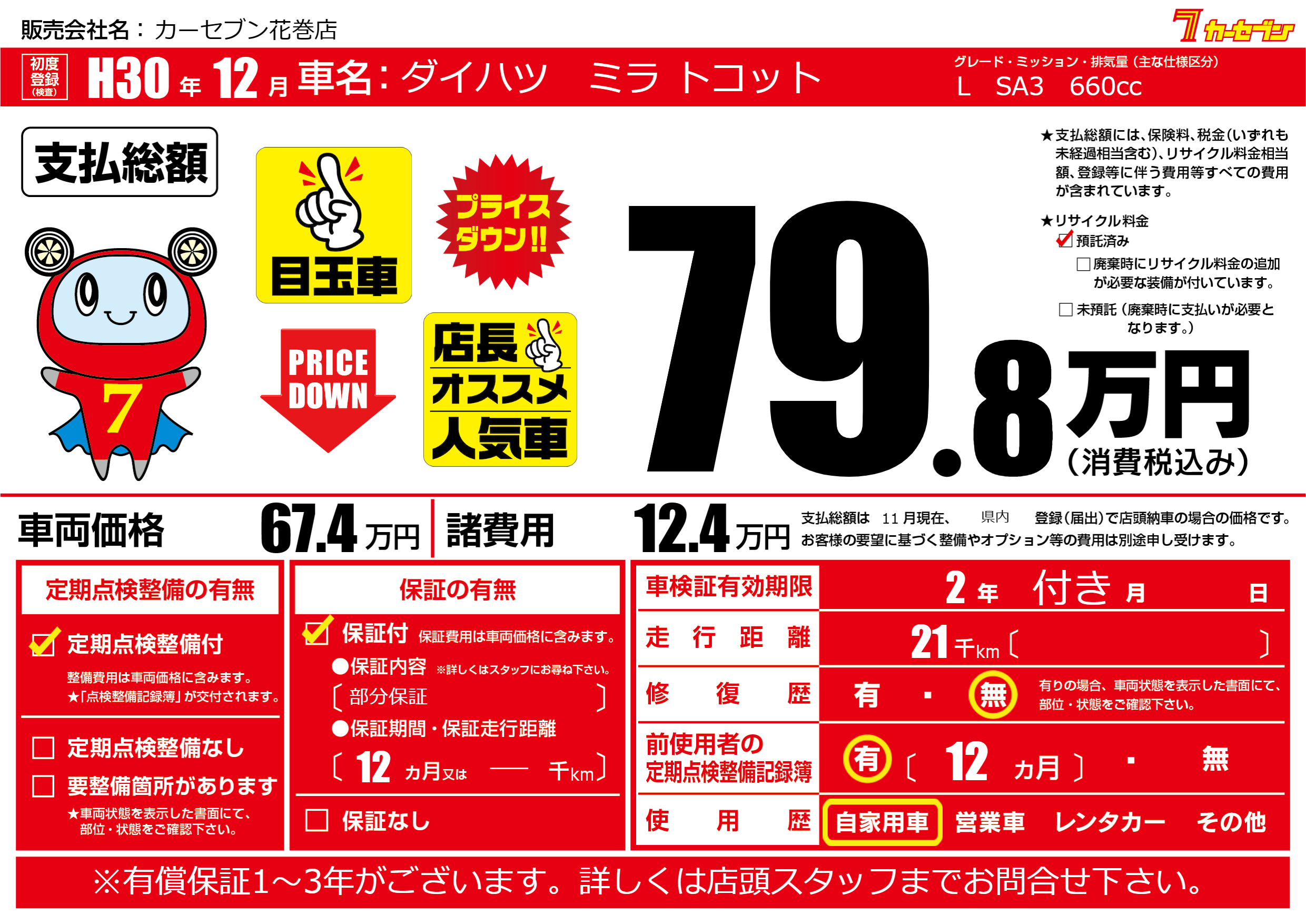| 走行キロ | 2.1万km | 初年度登録 | H30年12月 |