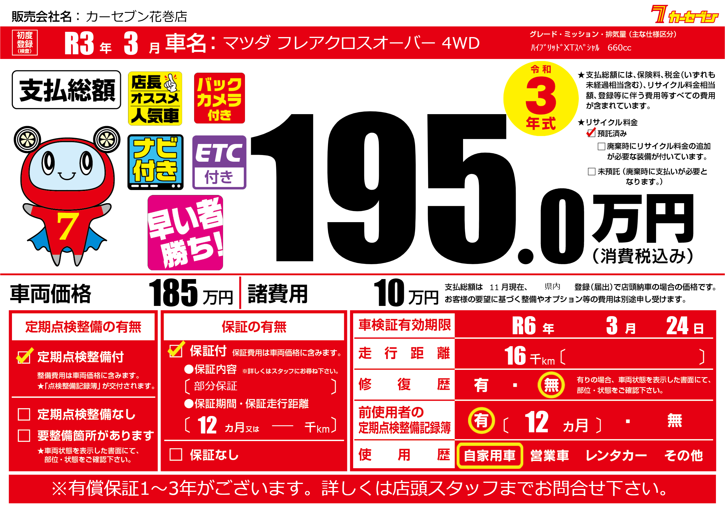 | 車名 | マツダ フレアクロスオーバー 4WD | グレード ミッション 排気量 |