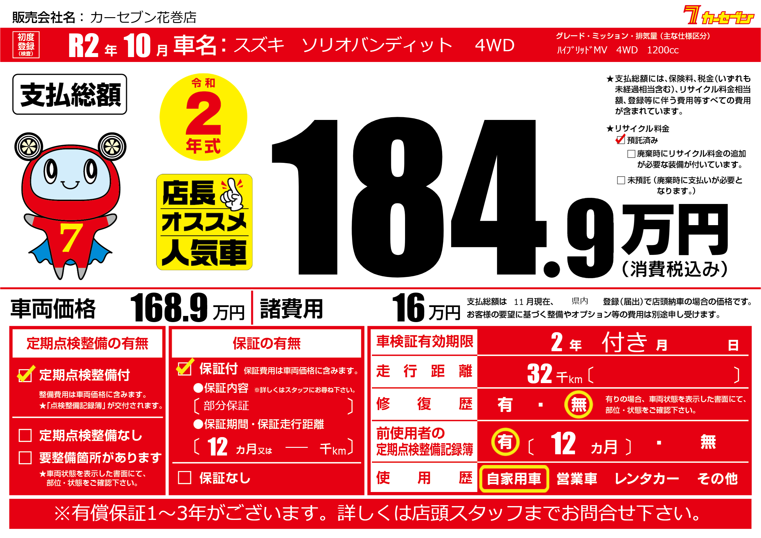 | 車名 | スズキ ソリオバンディット 4WD | グレード ミッション 排気量 |